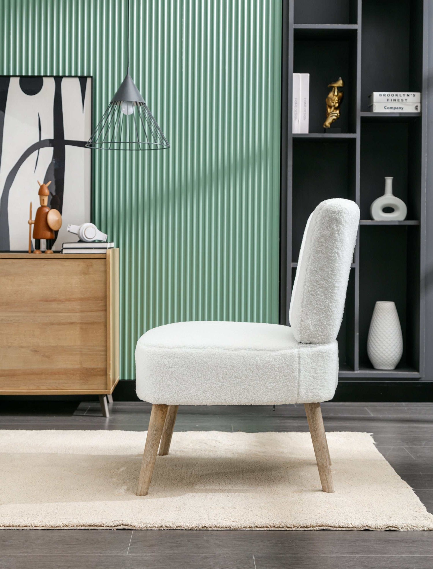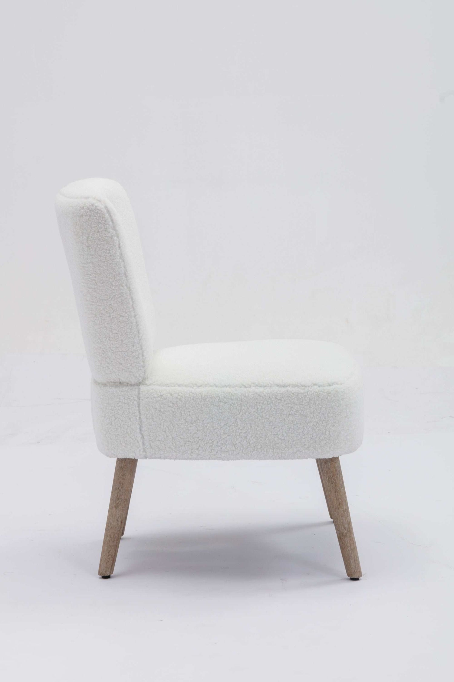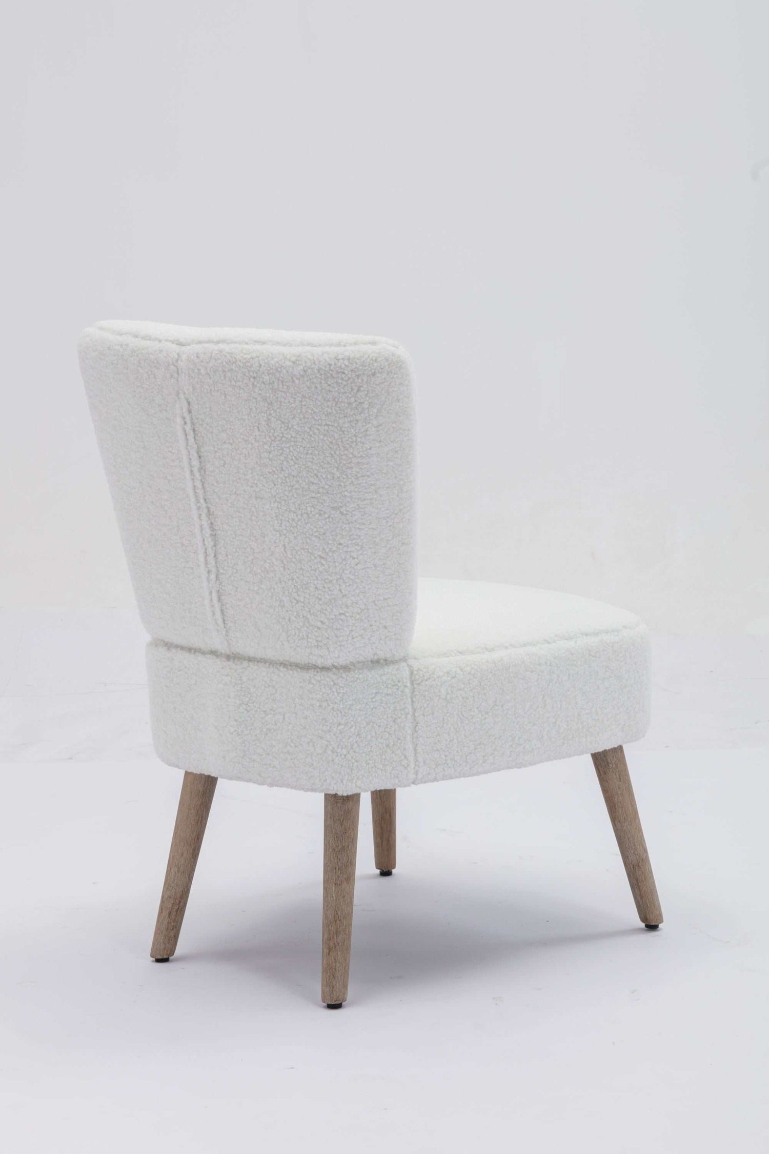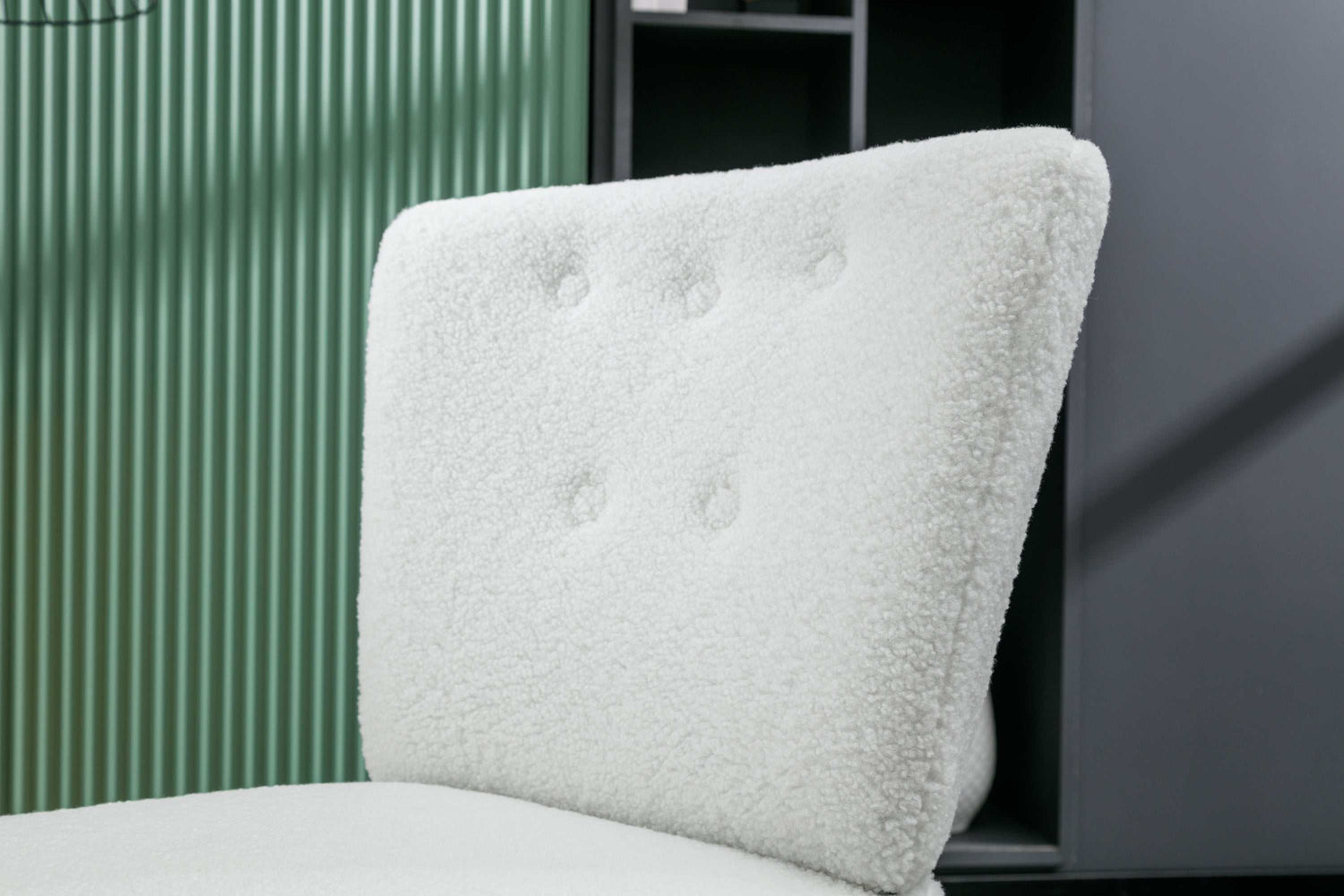 Elevate your dining room, living room, or bedroom with our inviting Teddy Fabric Slipper Chair. The sophisticated white teddy fabric upholstery provides a comfortable and inviting feel, making it an ideal choice for relaxation. The button tufting adds a touch of refinement, while the wooden legs offer a sturdy and stylish base. This slipper chair is designed to complement a wide range of settings, from dining rooms to living rooms and bedrooms.