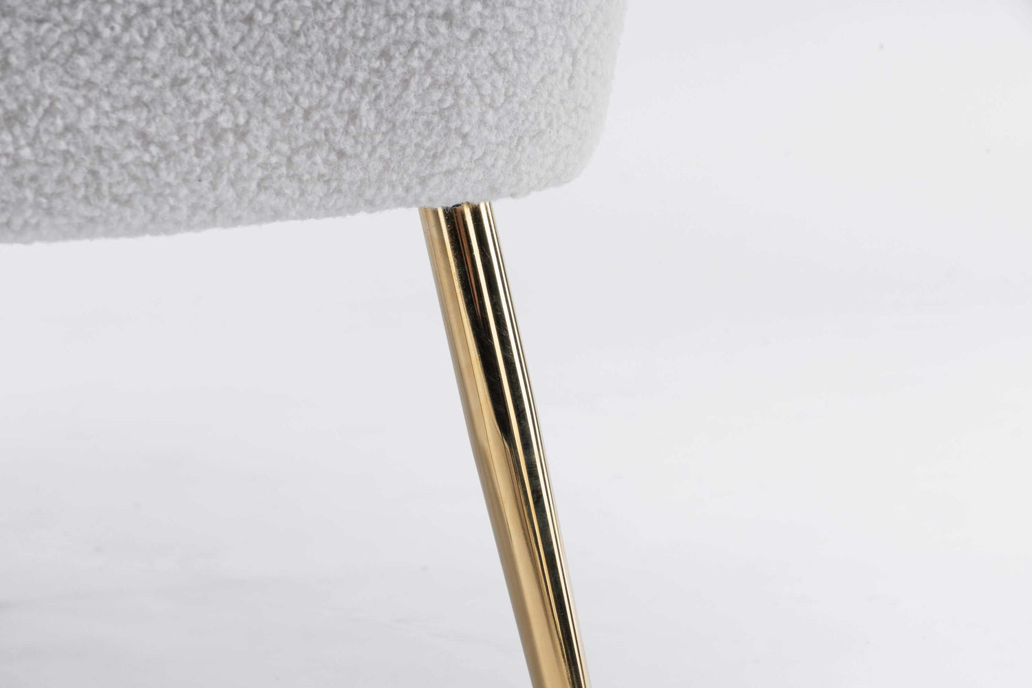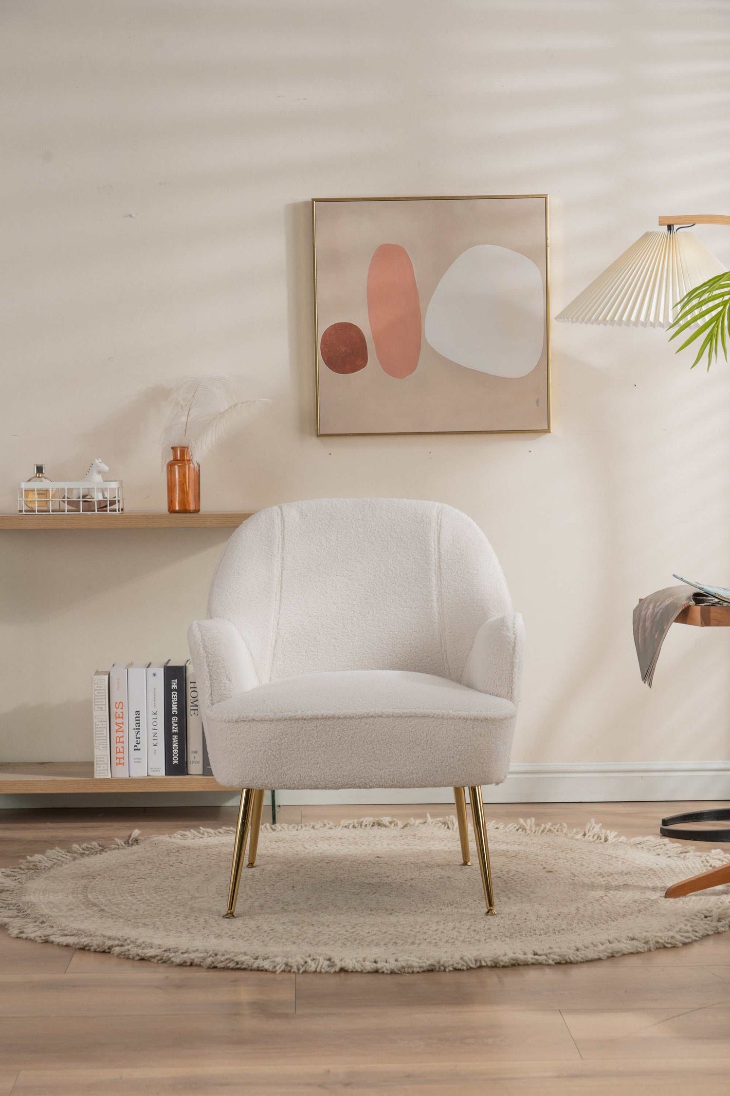 Elevate your living space with our ergonomically designed Modern Soft White Teddy Fabric Accent Chair. This chair is meticulously crafted with soft and plush Teddy fabric in a timeless white shade, offering a cozy and inviting seat. The elegant gold legs not only provide stability but also add a touch of sophistication to any room. Whether in the living room, bedroom, or any indoor space, this chair is tailored for both comfort and style. It even features adjustable legs for a customized seating experience.