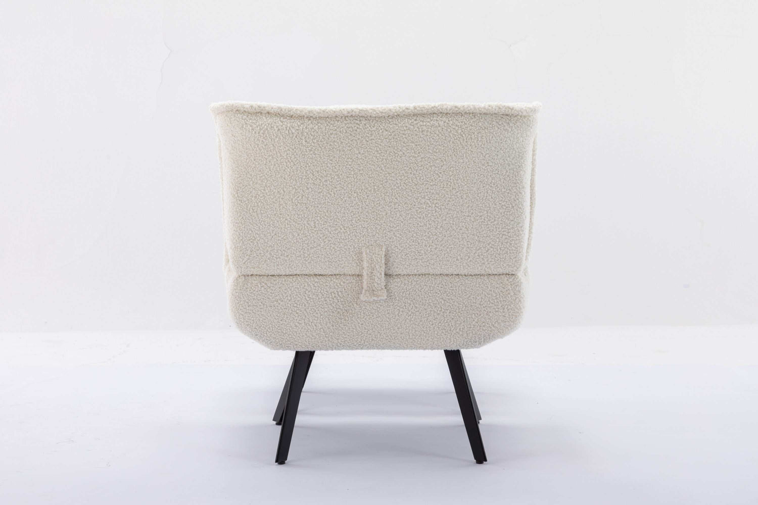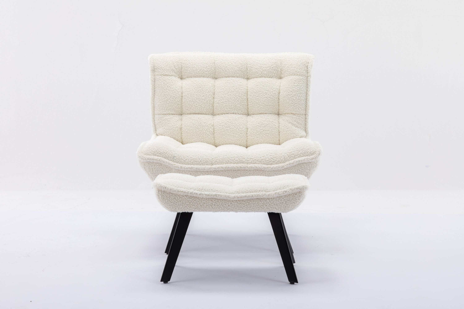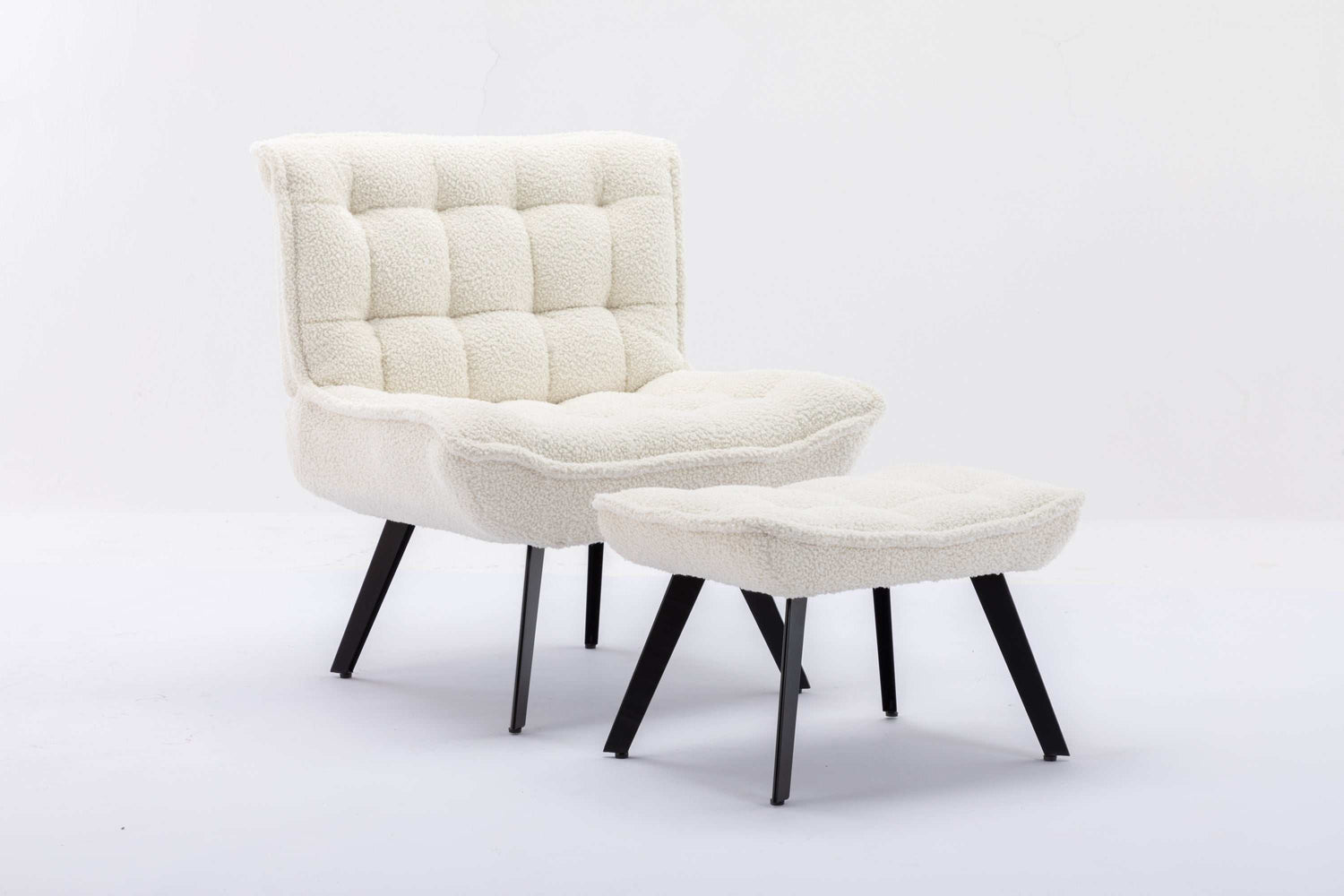 This is a contemporary boucle accent chair with an included ottoman, designed to add a touch of soft and comfort to your indoor living space. The chair is generously sized and offers plush cushioning for relaxation. It features sleek black legs that contrast elegantly with the opulent boucle upholstery. This set is perfect for activities like reading, watching TV, or simply unwinding. Elevate your indoor living experience with this statement piece that combines style and comfort seamlessly.