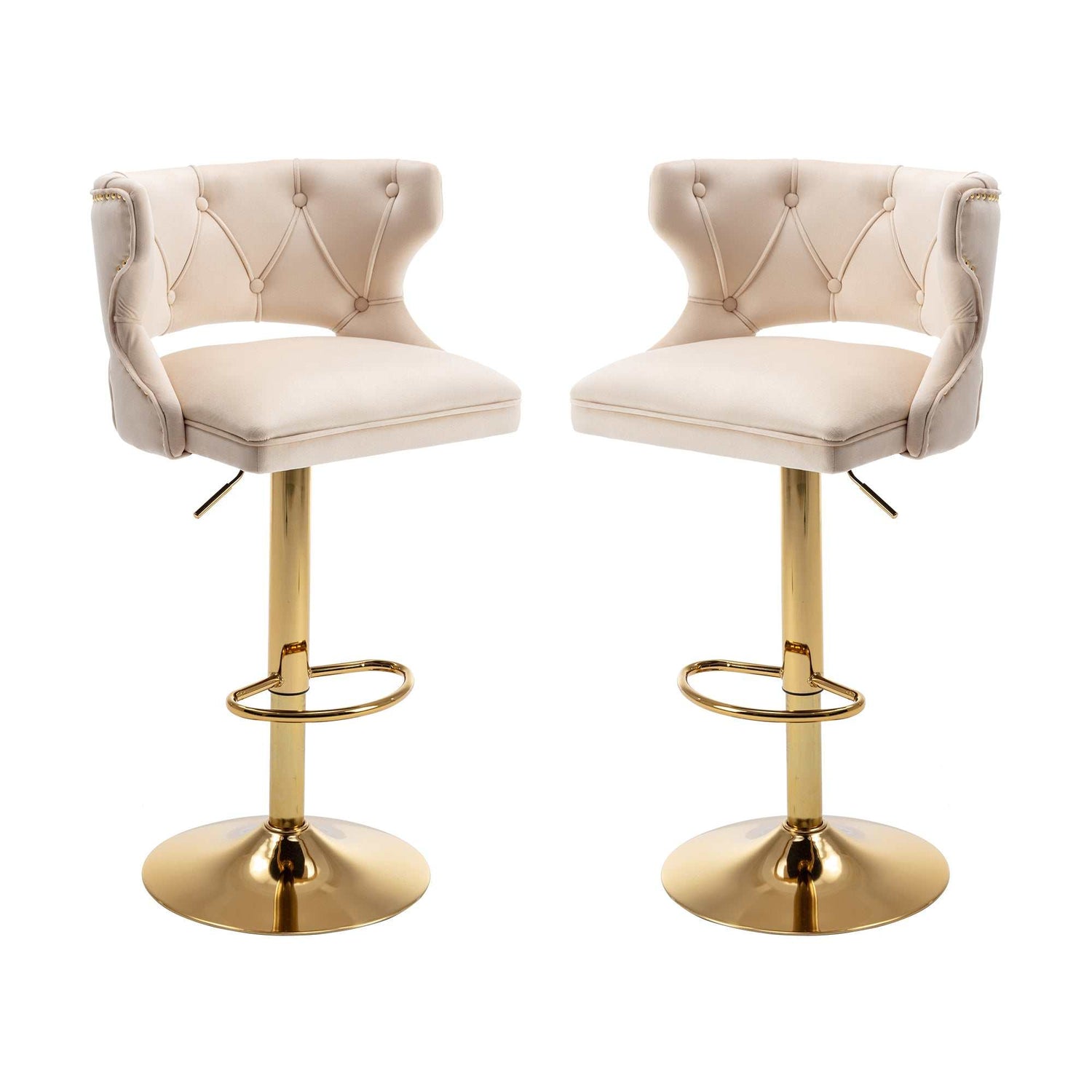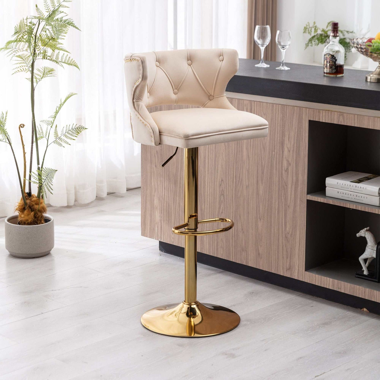 Elevate your dining experience with our set of two Bar Stools. Designed with comfort in mind, these stools feature a supportive backrest and a convenient footrest, allowing you to sit back and relax while enjoying your meals. The luxurious velvet upholstery in a timeless beige hue adds a touch of sophistication to your space.