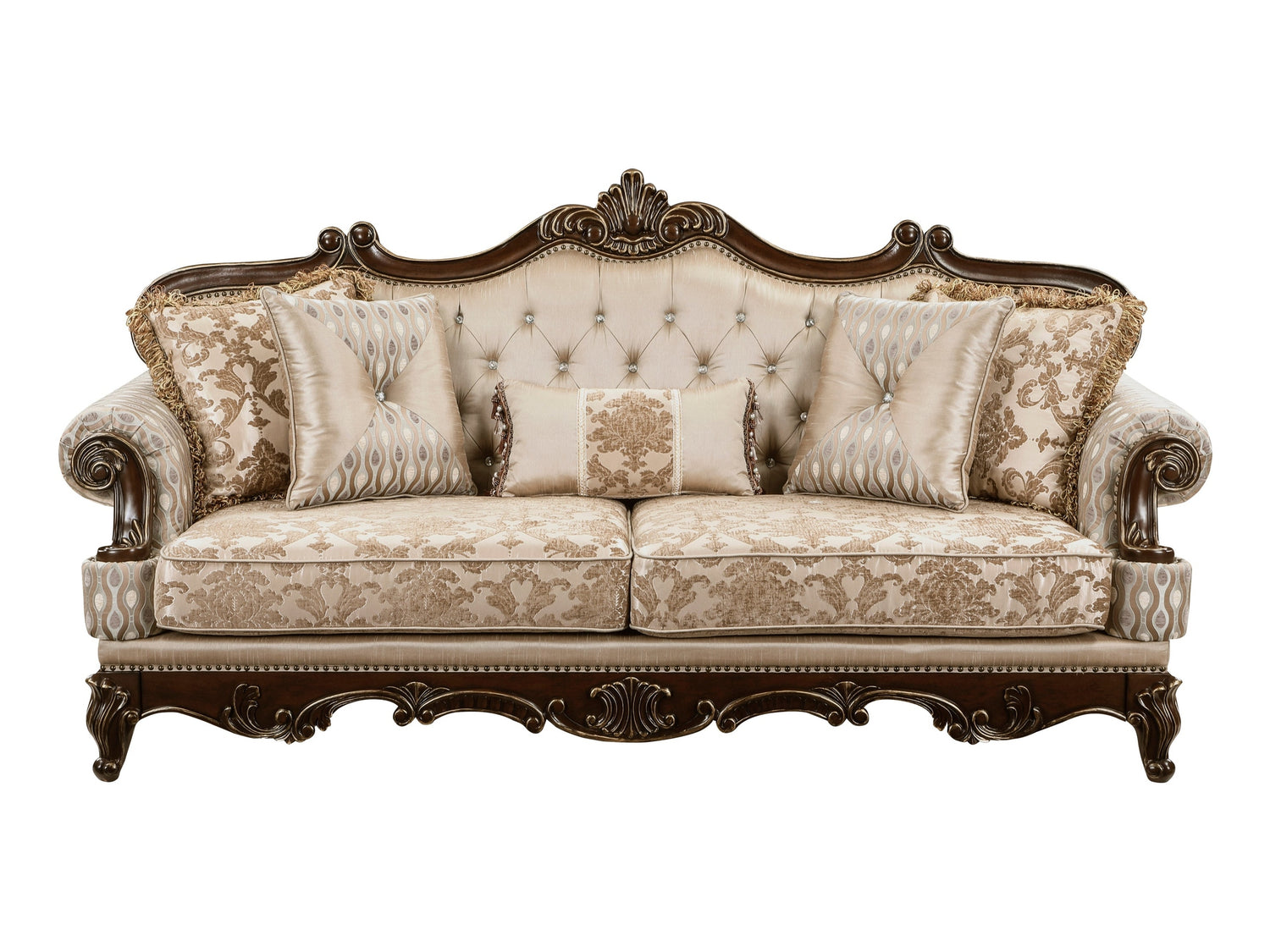 An elegant combination of traditional elements is paired to create the timeless look of the Balthasar Collection. The eye-catching design of the base and top rail of the sofa features a cherry finish with gold tipping, the elegant detail a perfect pairing to the complementing contrast of the patterned brown chenille fabric upholstery. Faux crystal-tufted, and trim detailed, the sofa also features five coordinating toss pillows. Furthering the traditional aesthetic are the round arms and contoured arm fronts.