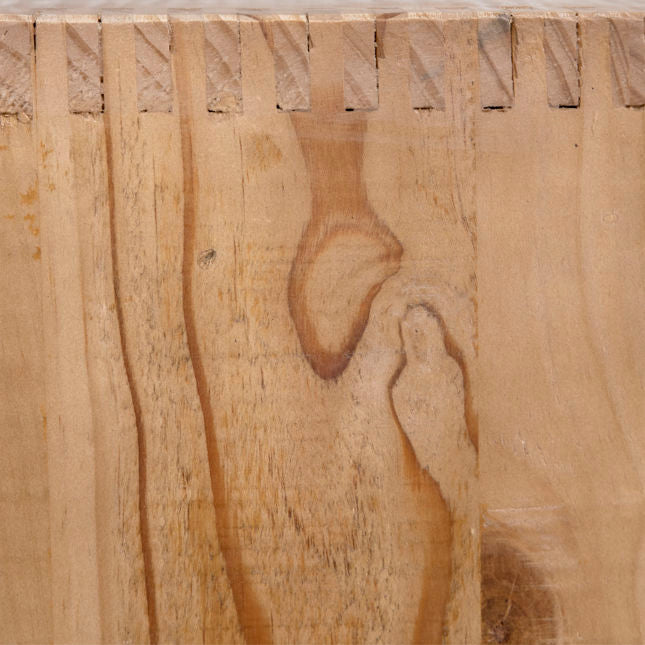 The Abaco Sideboard, crafted from reclaimed pine wood, combines sustainability with rustic charm. Its weathered finish highlights the wood's natural grain, adding a touch of timeless elegance and warmth to any space while providing practical storage solutions.
