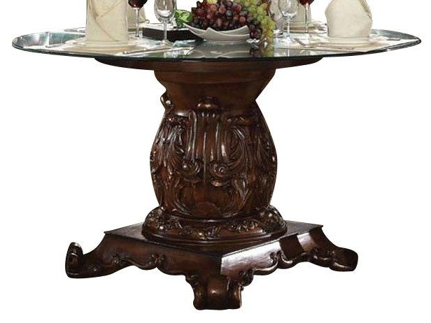 The Vendome traditional dining collection features a pedestal dining table complemented with oversized upholstered chairs all accented by floral carving decorative base and feet. Matching curio reflects all carefully selected design features as the dining collection.