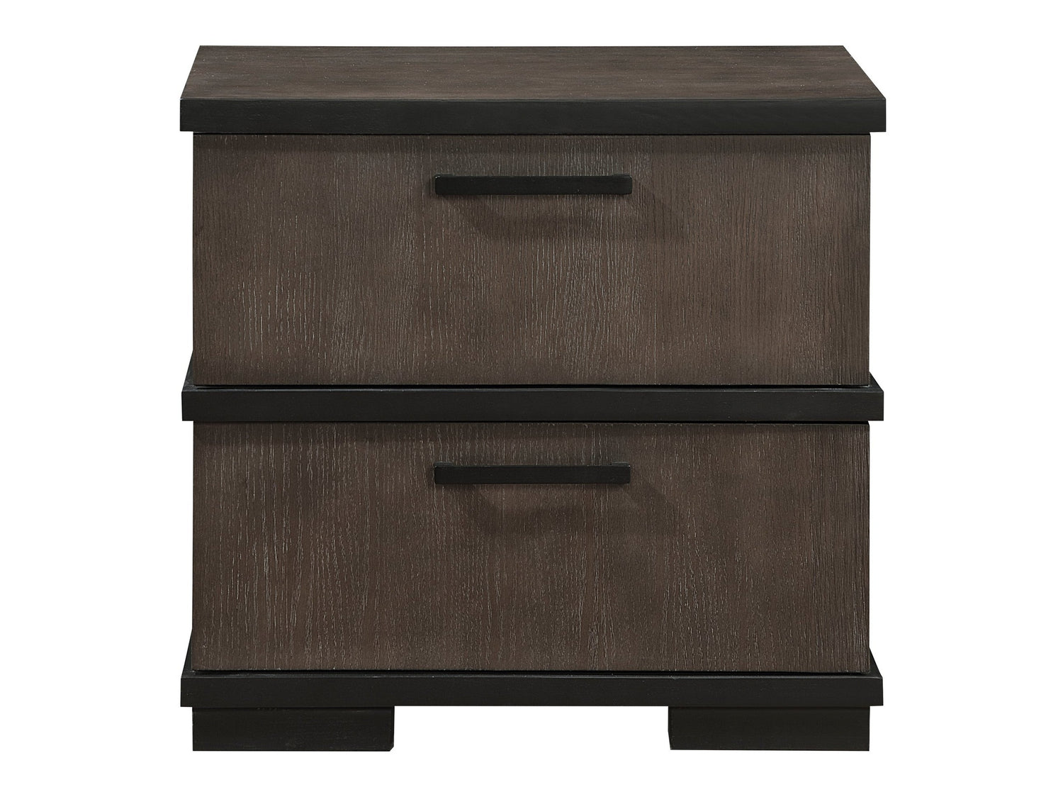 Modern lines pair with texture and hue to create the dynamic look of the Acworth Collection. The two-tone brown-ish gray and black finish over oak veneer of the collection lends to the modern-industrial inspired aesthetic that comprises the collection’s design. Black bar hardware fronts the drawers of the drawers of the nightstand, their minimalistic lines providing bold accent to the piece.