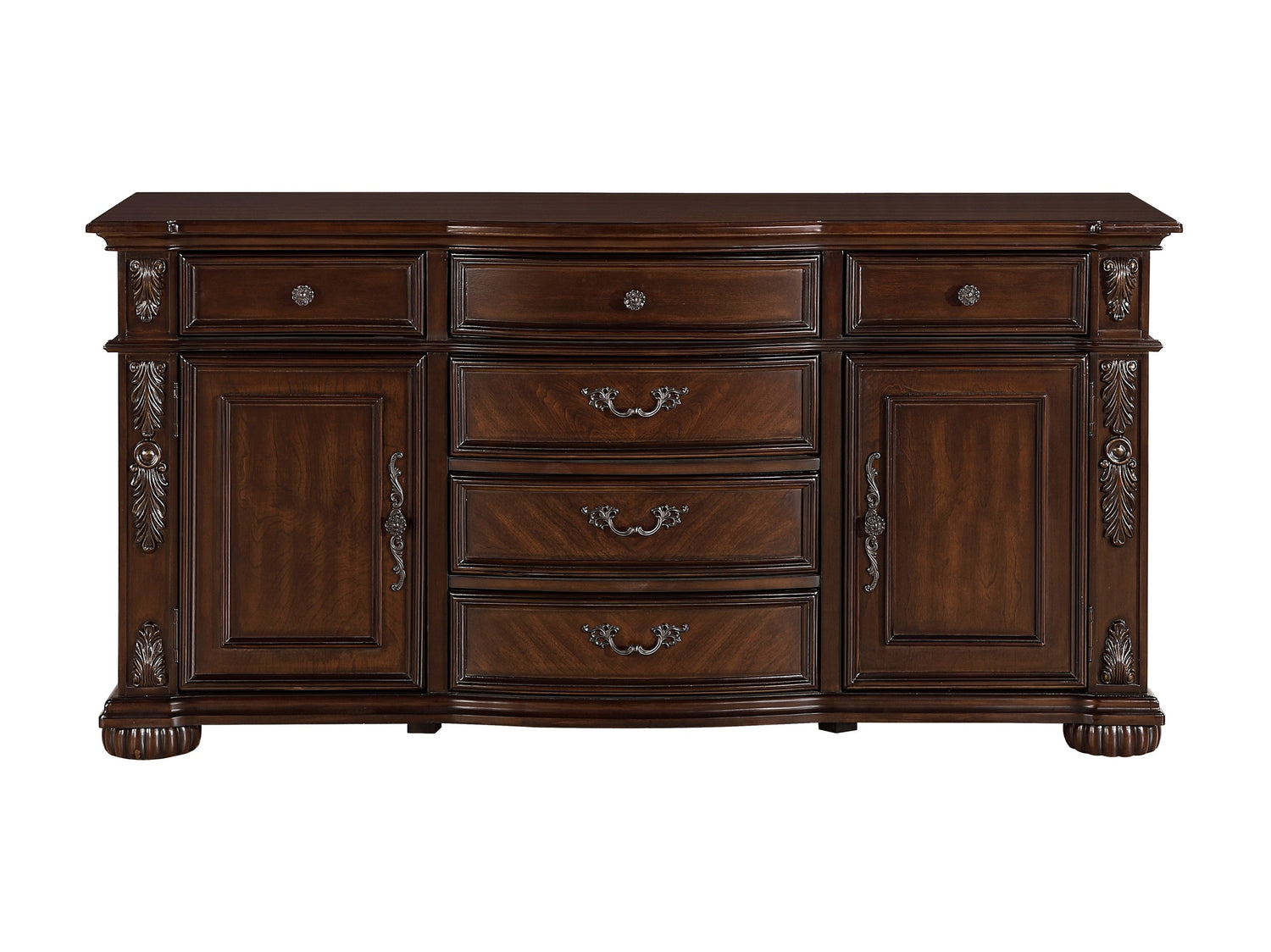 Rich in the aesthetic of Old-World tradition, the design of the Adelina Collection is the culmination of classic accenting that creates an elegant presentation for your dining room. The intricate scroll detail of the buffet/server provides eye-catching detail. The acanthus leaf carvings and bun feet that support buffet/server provide additional traditional accenting. The serpentine front of the buffet/server features framed drawer and door storage with fixed-pull traditional hardware. Furthering the timeless aesthetic that permeates the collection, is the cherry finish, with gold tipping, over birch veneer and pine solids.