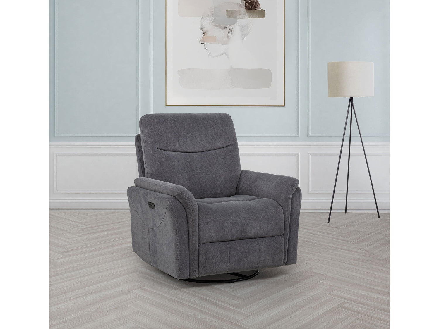 - Item Name: Adler Charcoal Grey Upholstered Power Swivel Glider Recliner