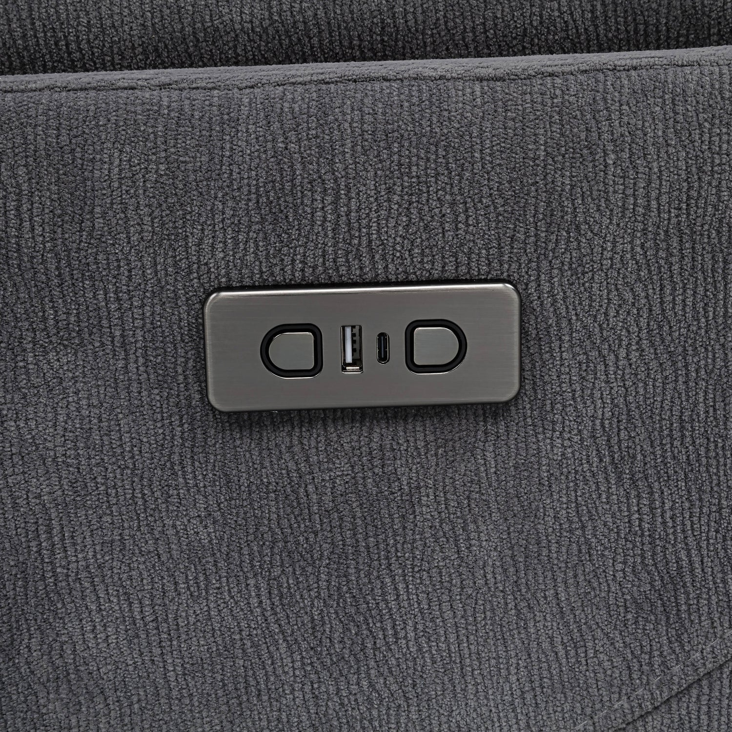 - Upholstered in soft charcoal grey fabric with plush foam cushions for all-day relaxation,