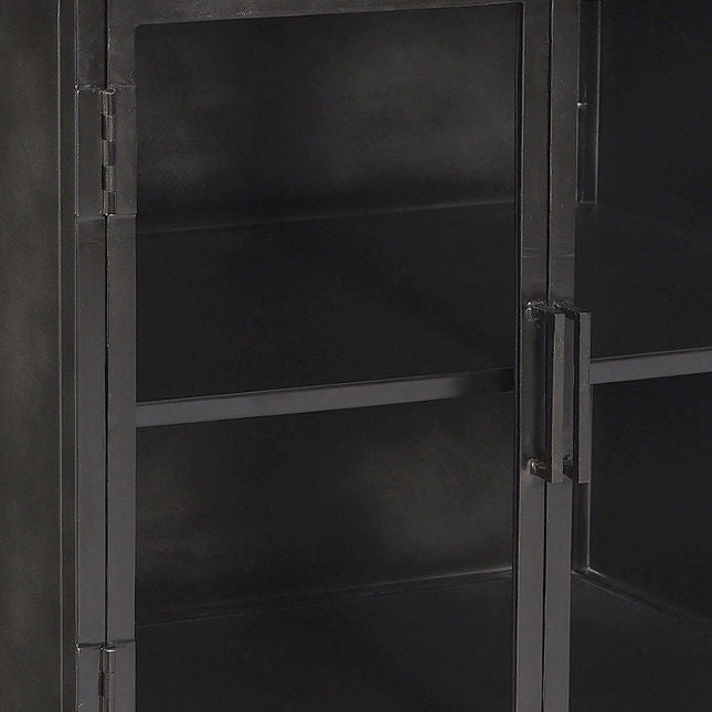 Bring a touch of industrial chic to your home with this elegant case piece. Standing at 26 inches in length, this sidetable is constructed in solid iron finished in an antique gunmetal finish and accented to window display style glass panel door fronts. Inside, you'll find a built-in glass shelf for additional storage.