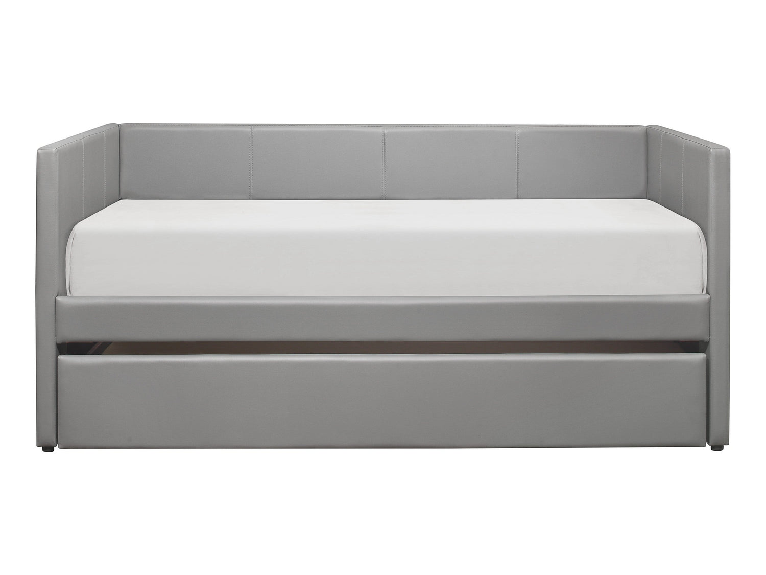The Adra Collection blends contemporary lines and a gray faux leather covering, creating a look that will compliment your home’s decor. Whether used for sleeping or relaxing, the clean-line trundle design allows for placement in a number of room sizes and configurations, while the under-bed trundle pulls out to accommodate your additional sleep space needs.