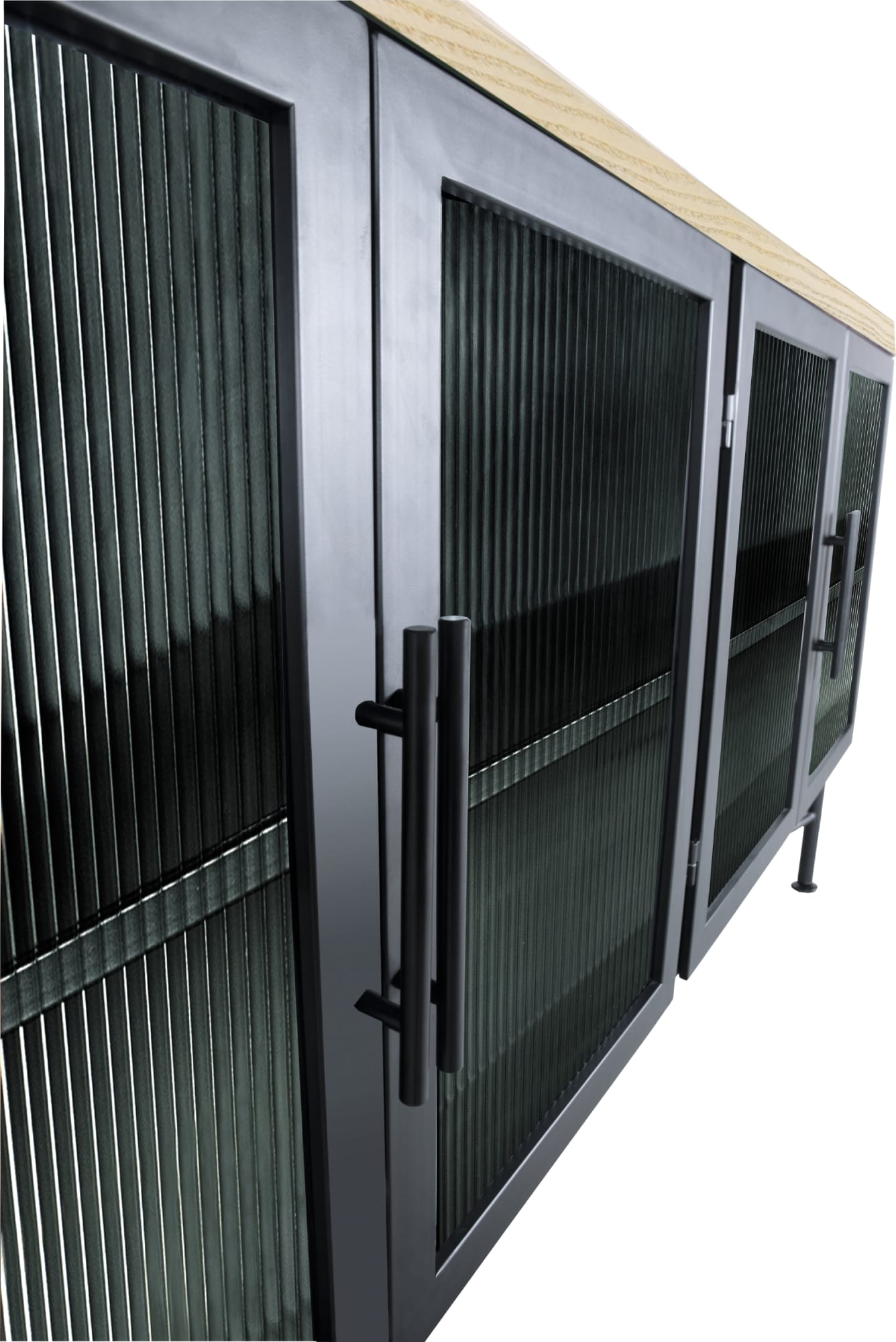 - Ribbed glass doors provide the flexibility to use cabinets for storage or display