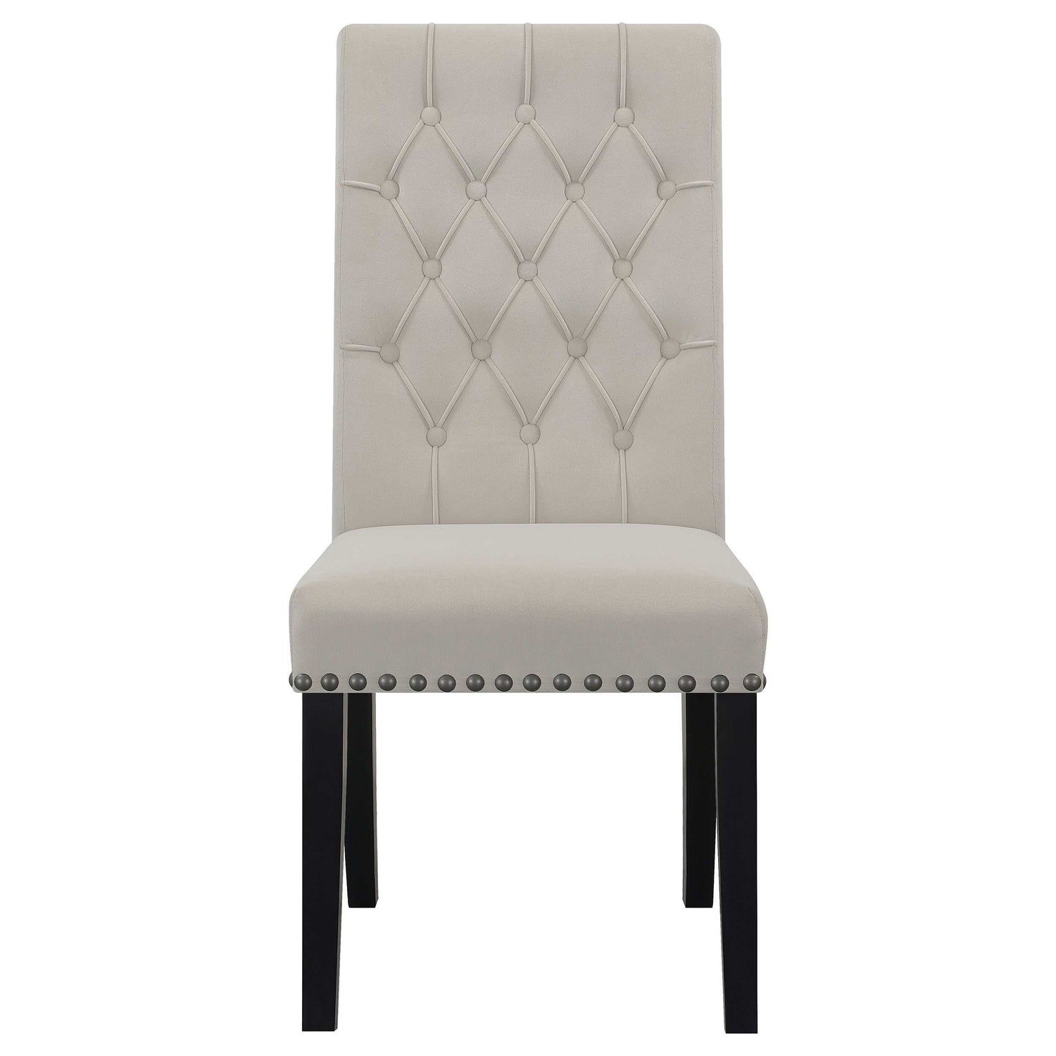 Versatile and elegant, this transitional side chair lends a classical touch to a variety of home decor styles. A rolled backrest with button tufted details lends a traditional aesthetic to a space. Pushing the classic elements is a padded seat with individual nailhead trim that offers a charming detail. Rest easy in this supportive, comfy seat, wrapped entirely in a linen-like fabric that offers a soft touch. Elevated by square shape tapered legs in a rustic espresso finish, this graceful side chair creates a wonderful addition to dining rooms, home offices and more.