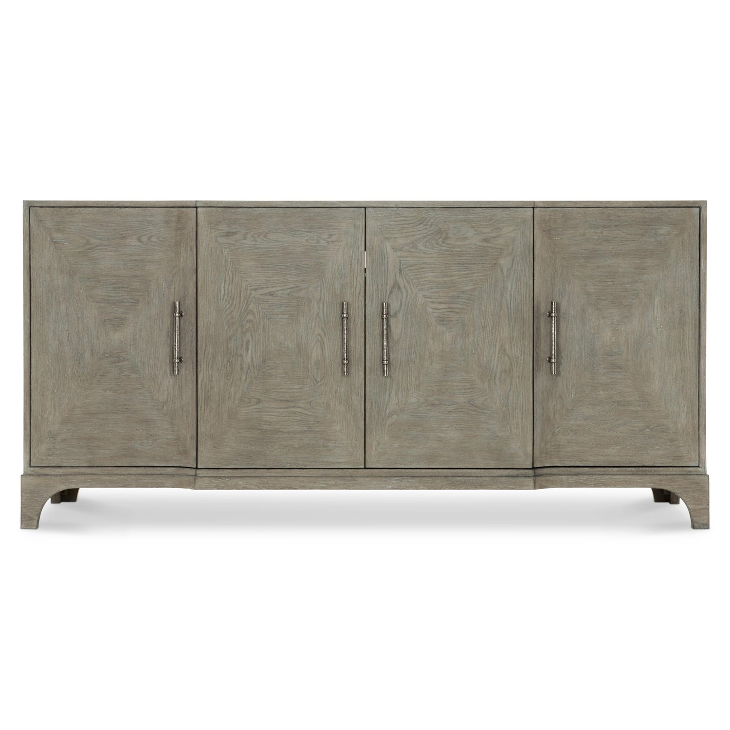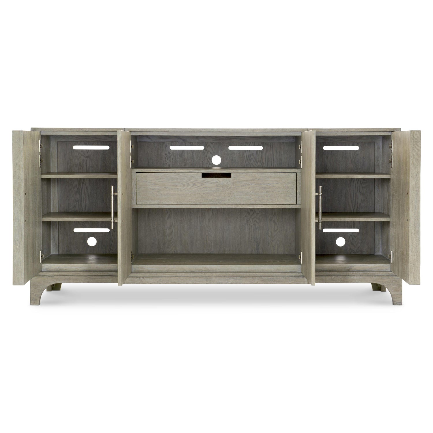 - Center doors also features one soft-close drawer with hand pull cut-out and bottom compartment