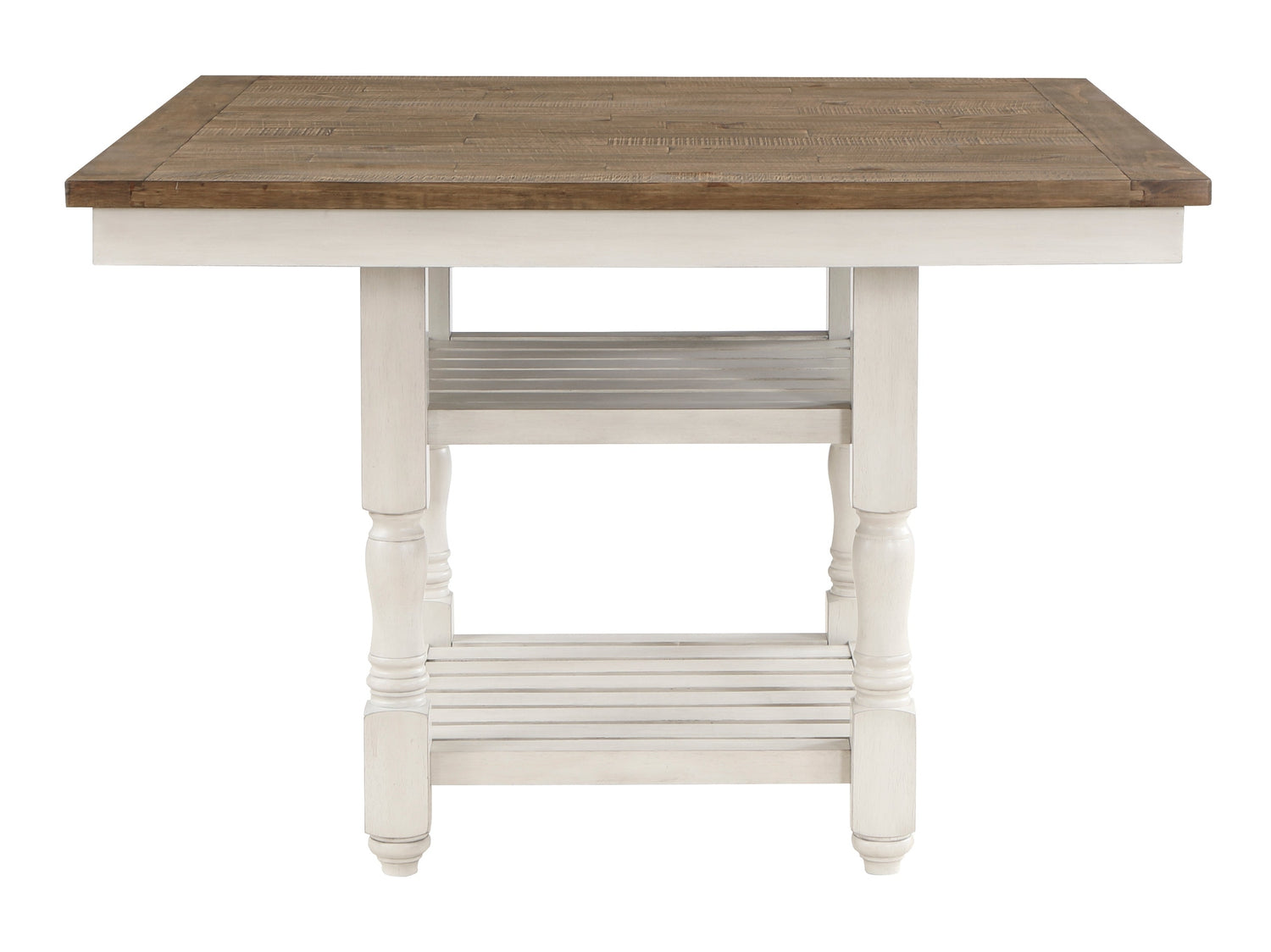 - Material: Made of pine veneer, wood and engineered wood, 2-tone finish (Tobacco brown and antique white), Base with built-in shelves, Seats 4, Counter height design, Assembly required