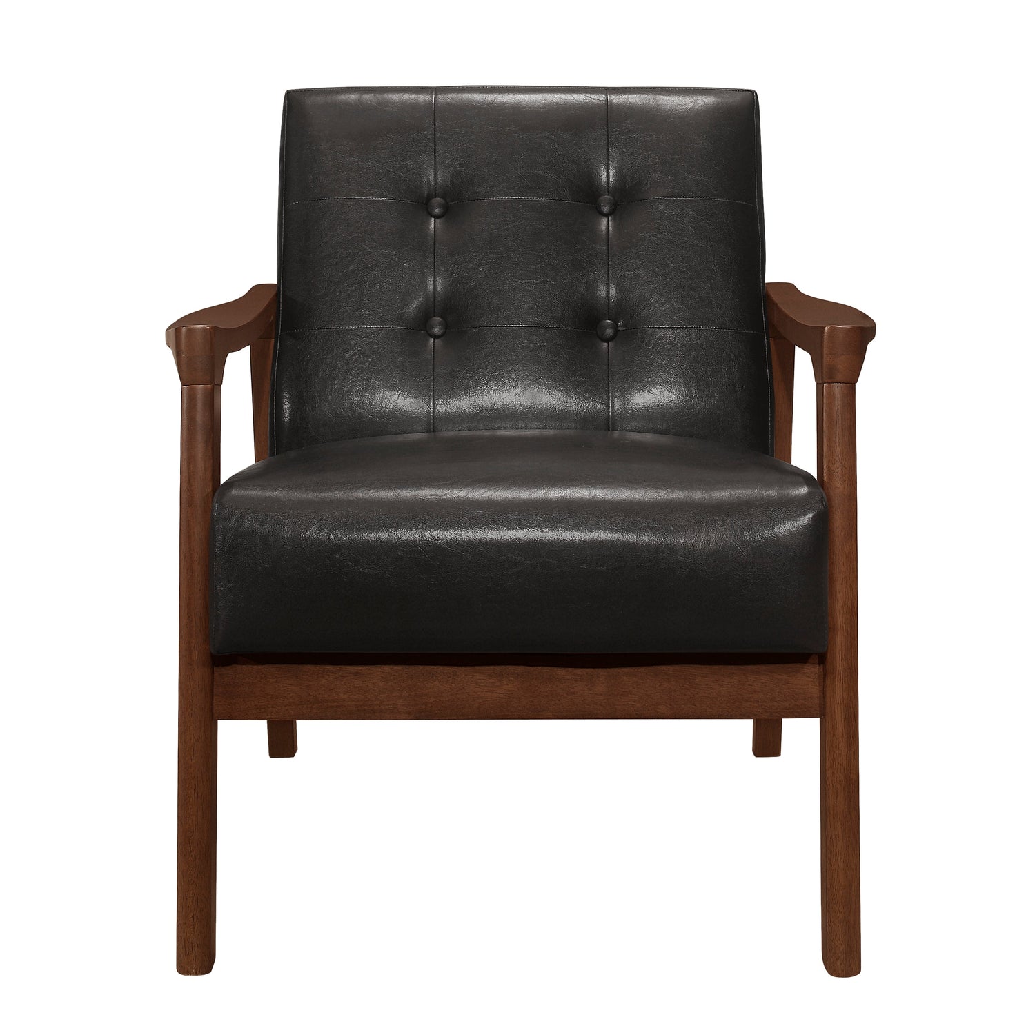 Mid-Century Modern lines define the profile of the Alby Collection accent chair. Contoured arms top the framing of the chair. The button-tufted back and plain seat of the chair are covered in dark brown faux leather upholstery, with walnut finish over solid wood.