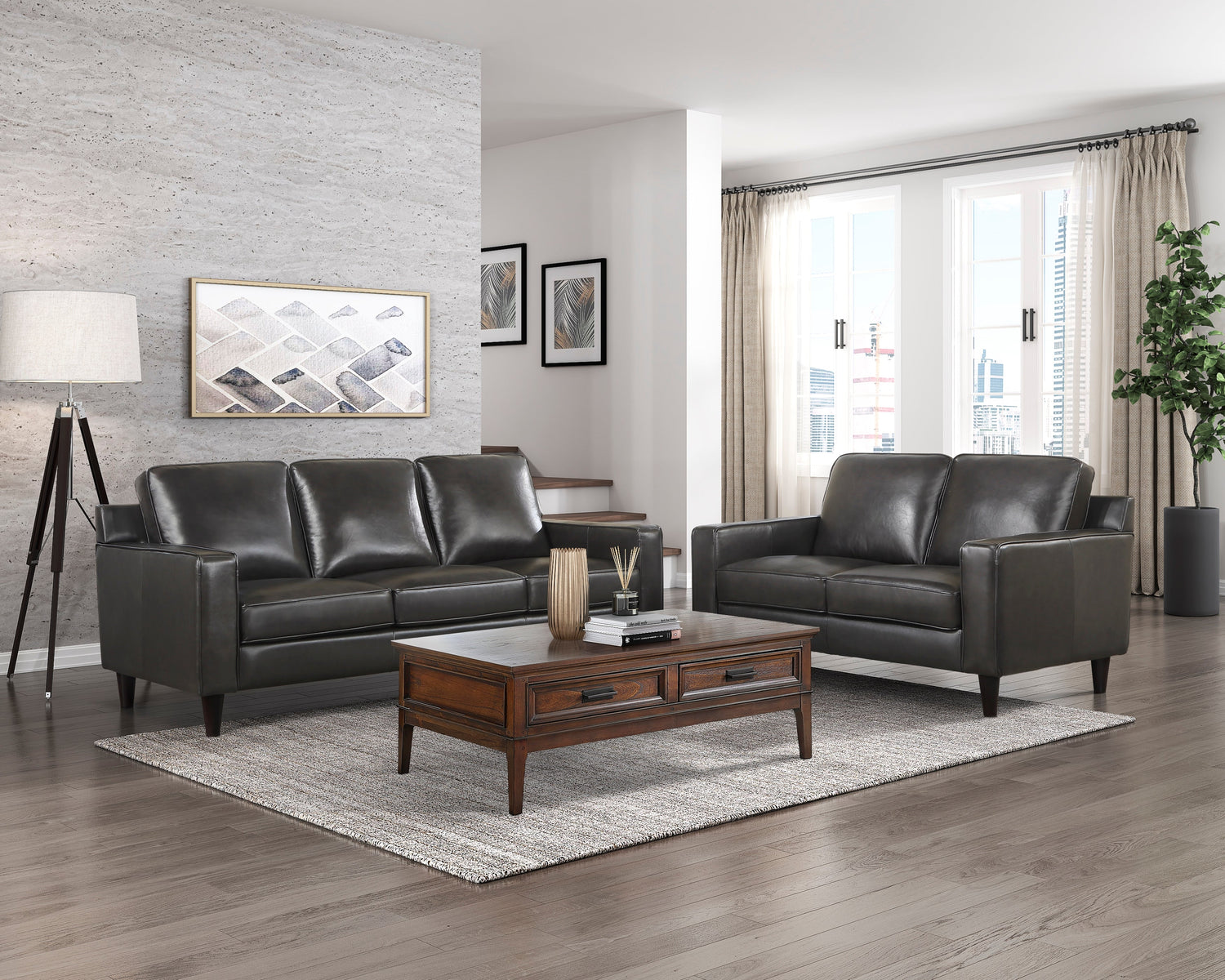 The tailored lines of the Aldrich Collection harken to the retro-inspired refinement of mid-century design, their understated elegance a perfect pairing for your living room. Gray genuine leather covers the frame of the sofa, where the body touches, with faux leather match everywhere else. The modern profile of the collection is supported by conical legs, while track arms define the timeless look.