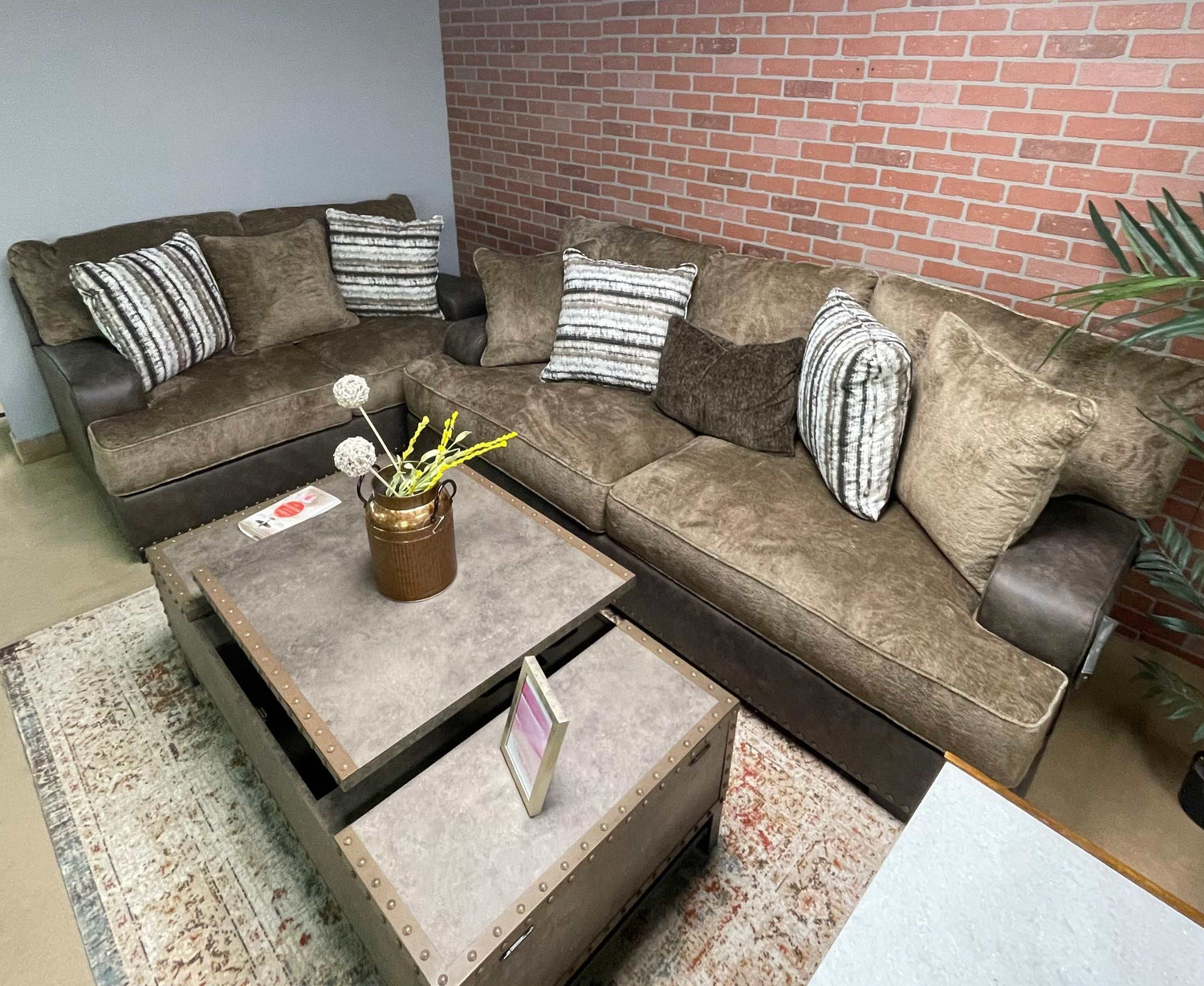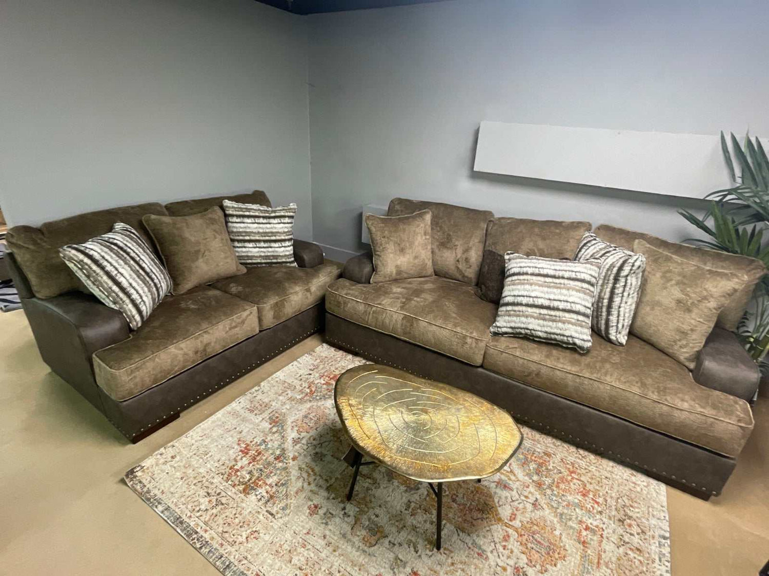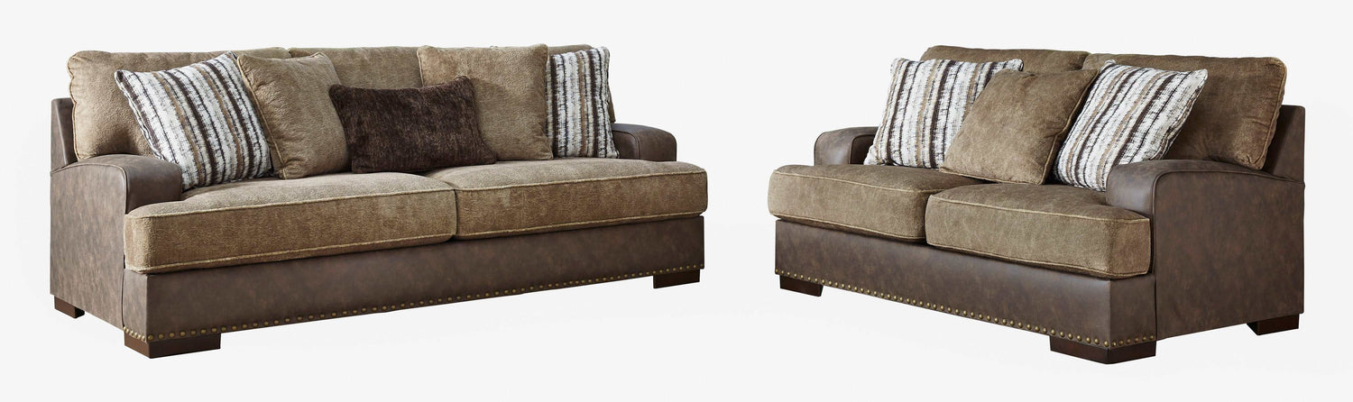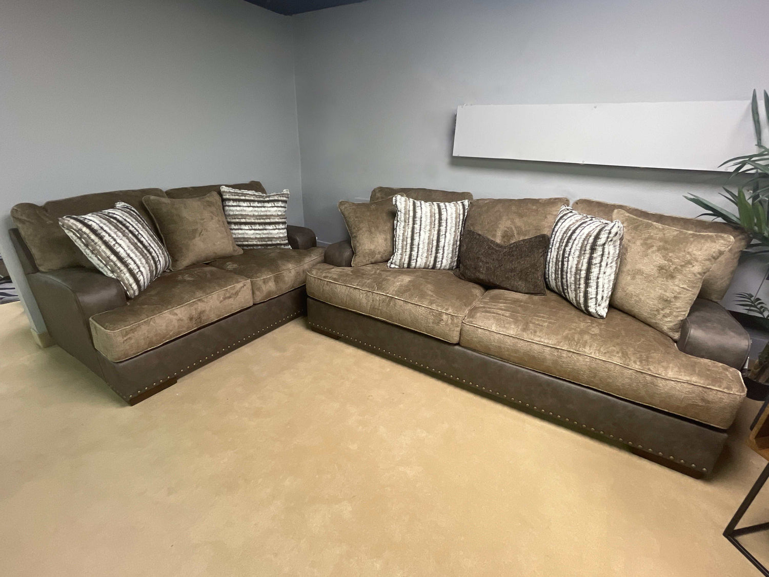 Punctuated by a subtle band of nailhead trim, this set is perfect for those who love the look of leather. Two textural tones provide twice the style and comfort—and incorporate an added layer of visual interest. Throw pillows add a fun decorative element.