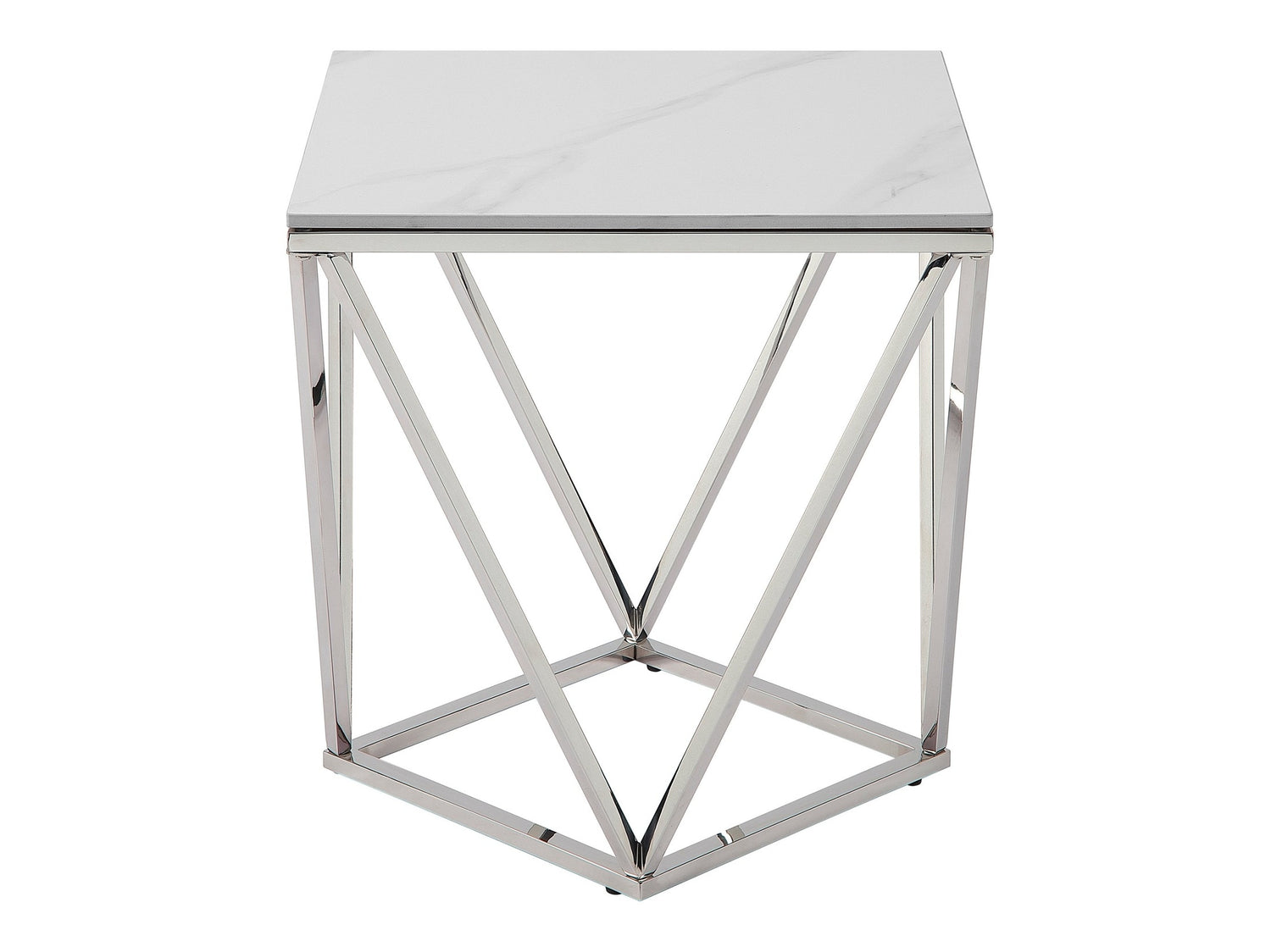 Modern refinement is captured in the design of the Alfeo Collection. Geometric lines intersect to create the unfettered stainless steel metal base frame of the end table, serving to support a white sintered stone tabletop.