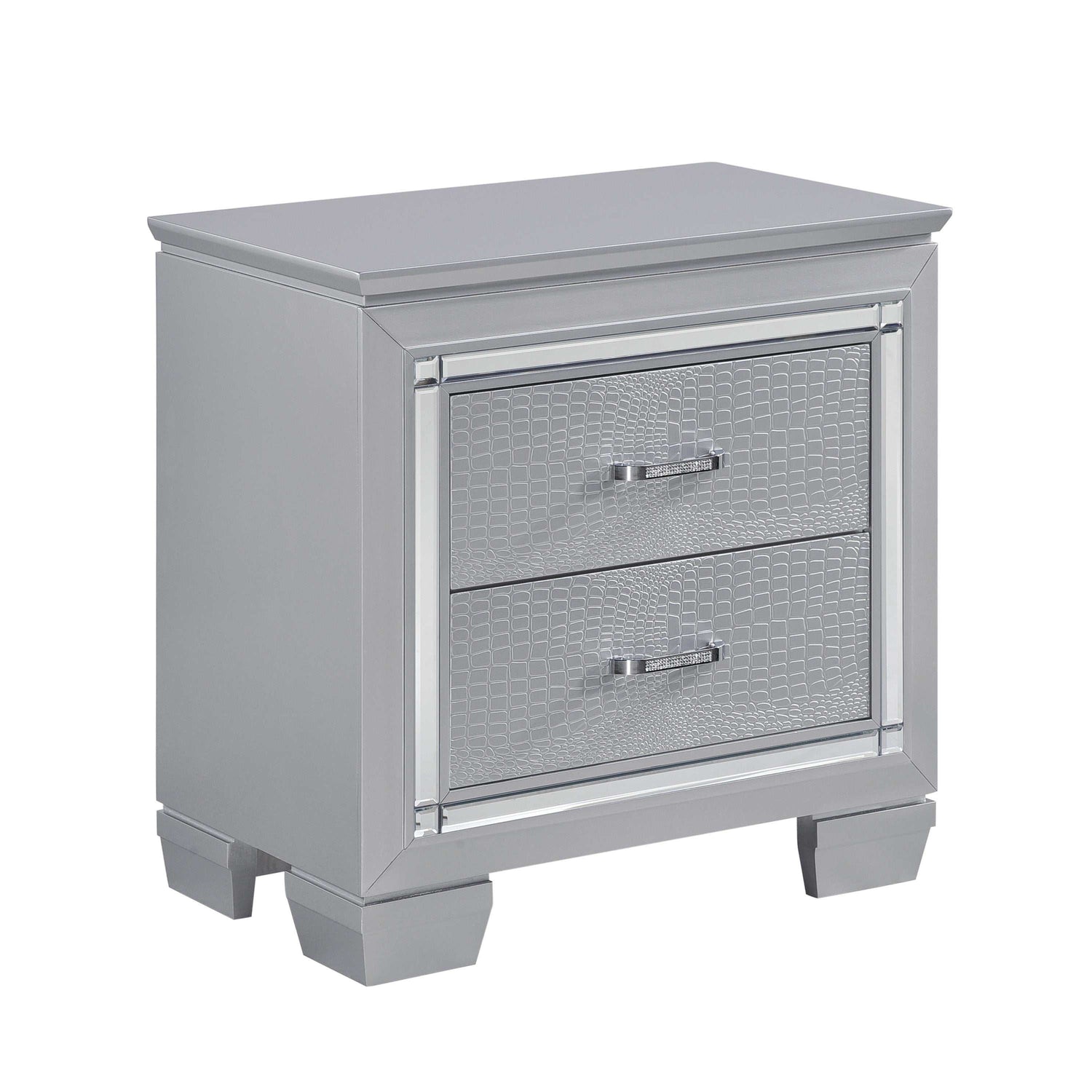 Glamour reigns in the design of the Allura Collection. The Framing Nightstand is a decorative beveled mirror accent. The alligator embossing of the drawer fronts is paired with high-polished crystal-enhanced hardware that boldly decorates the silver finish.