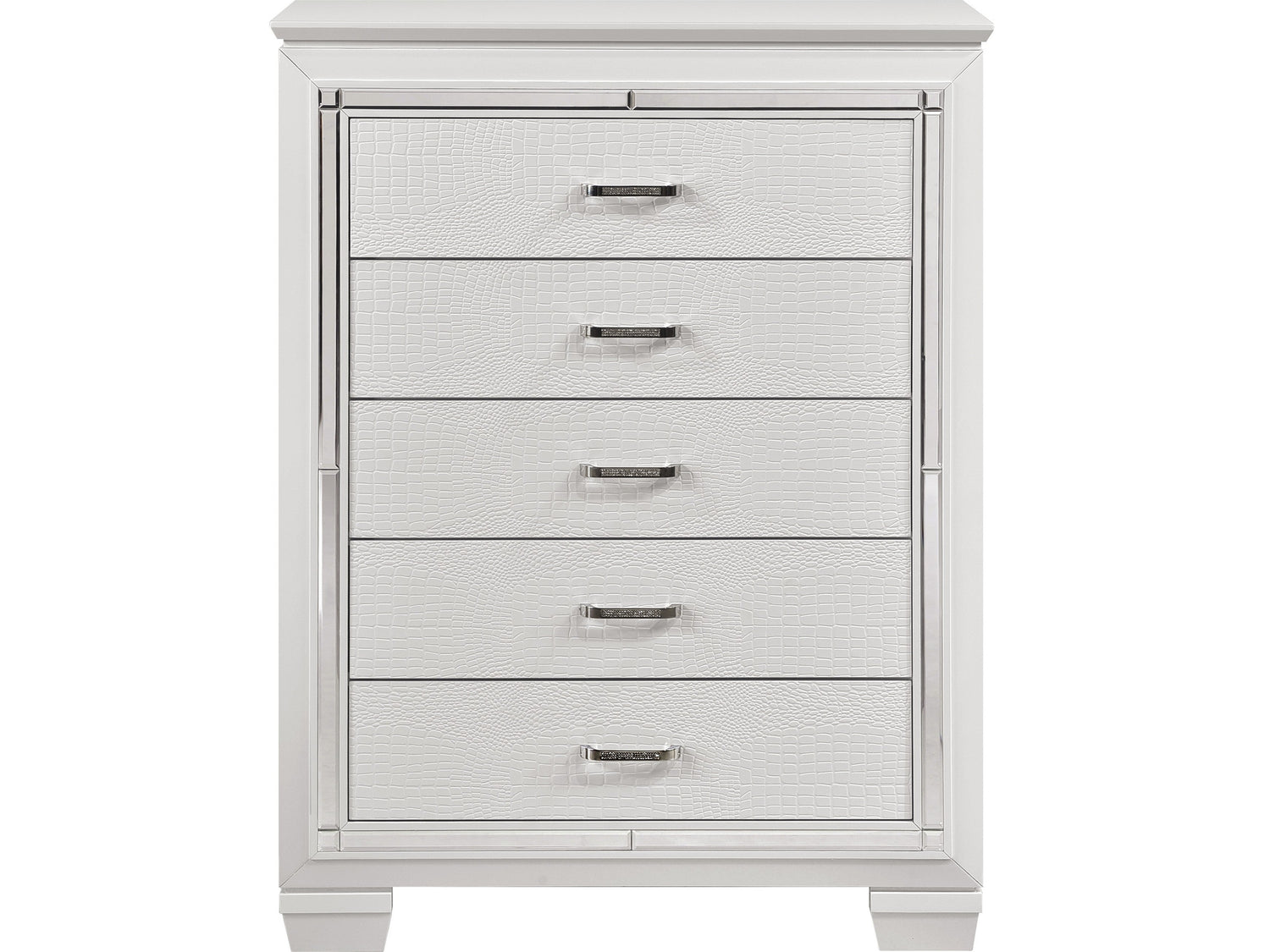 - Faux alligator embossed, textural drawer fronts with beveled mirror trim