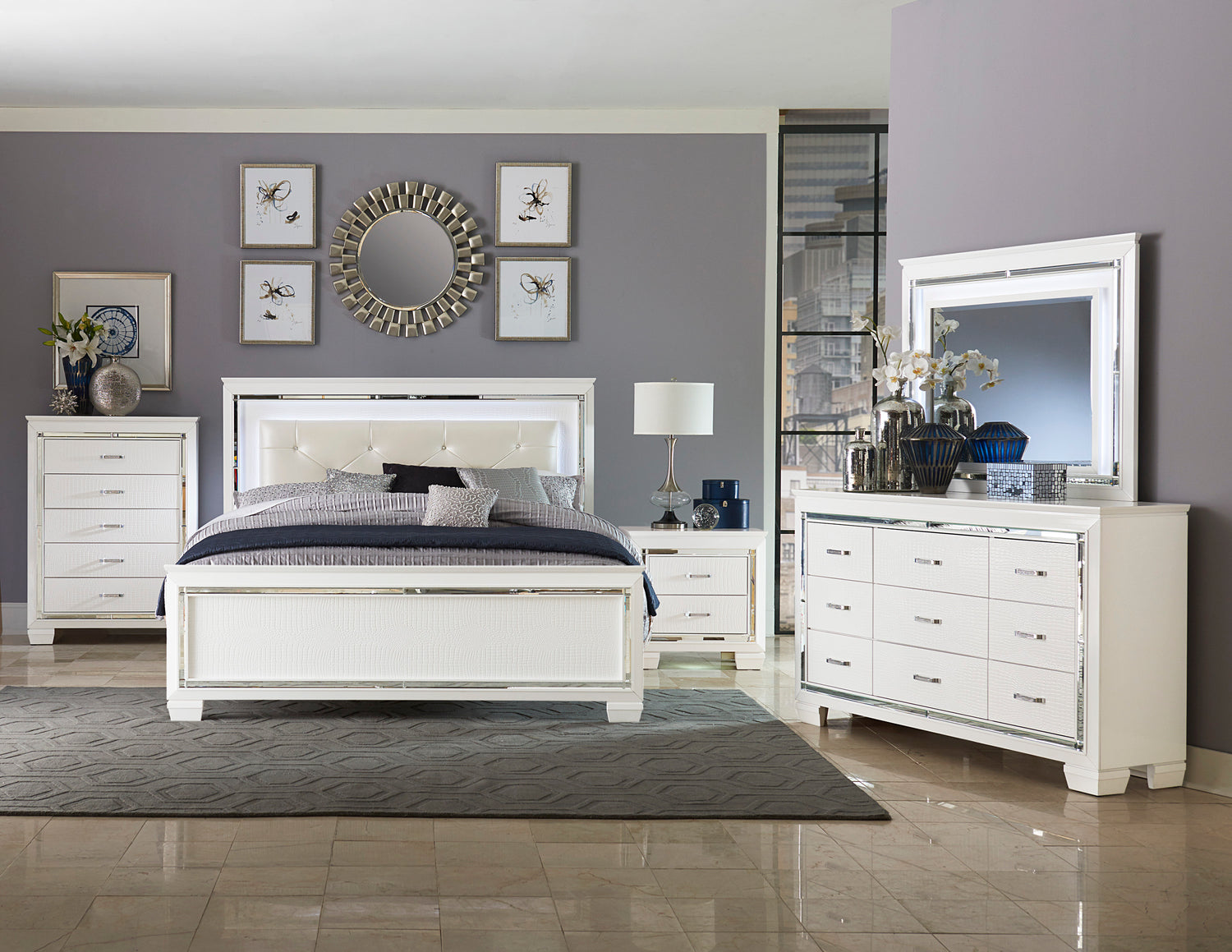 Glamour reigns in the design of the Allura Collection. Framing the dresser is a decorative beveled mirror accent that reflects the alligator embossing of the drawer fronts, along with the high polished crystal-enhanced hardware that boldly decorates the silver finish.