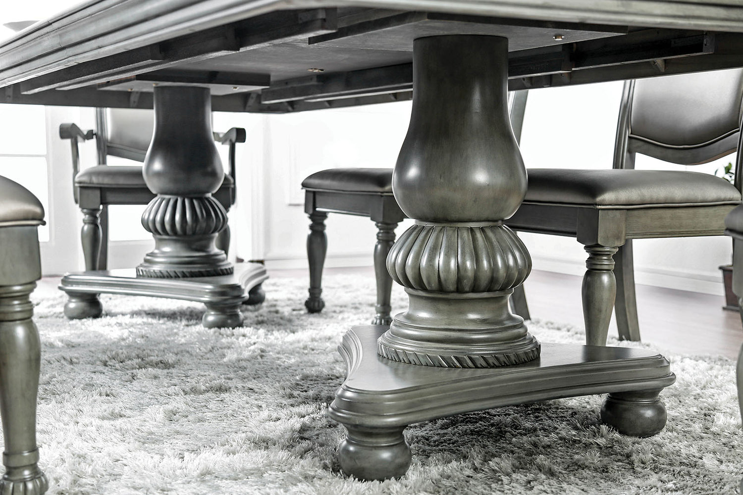 Shine up your silverware, bring out the glassware and get ready for the dinner party of the century with this glorious, traditional style dining table. The ornate double pedestal base provides the perfect structure for the crisscross patterned table top that, with its large 24-inch expandable leaf, can fit all the friends and family you can imagine. Pair with upholstered chairs featuring espresso leatherette, rope-like trim and elegant carved legs.