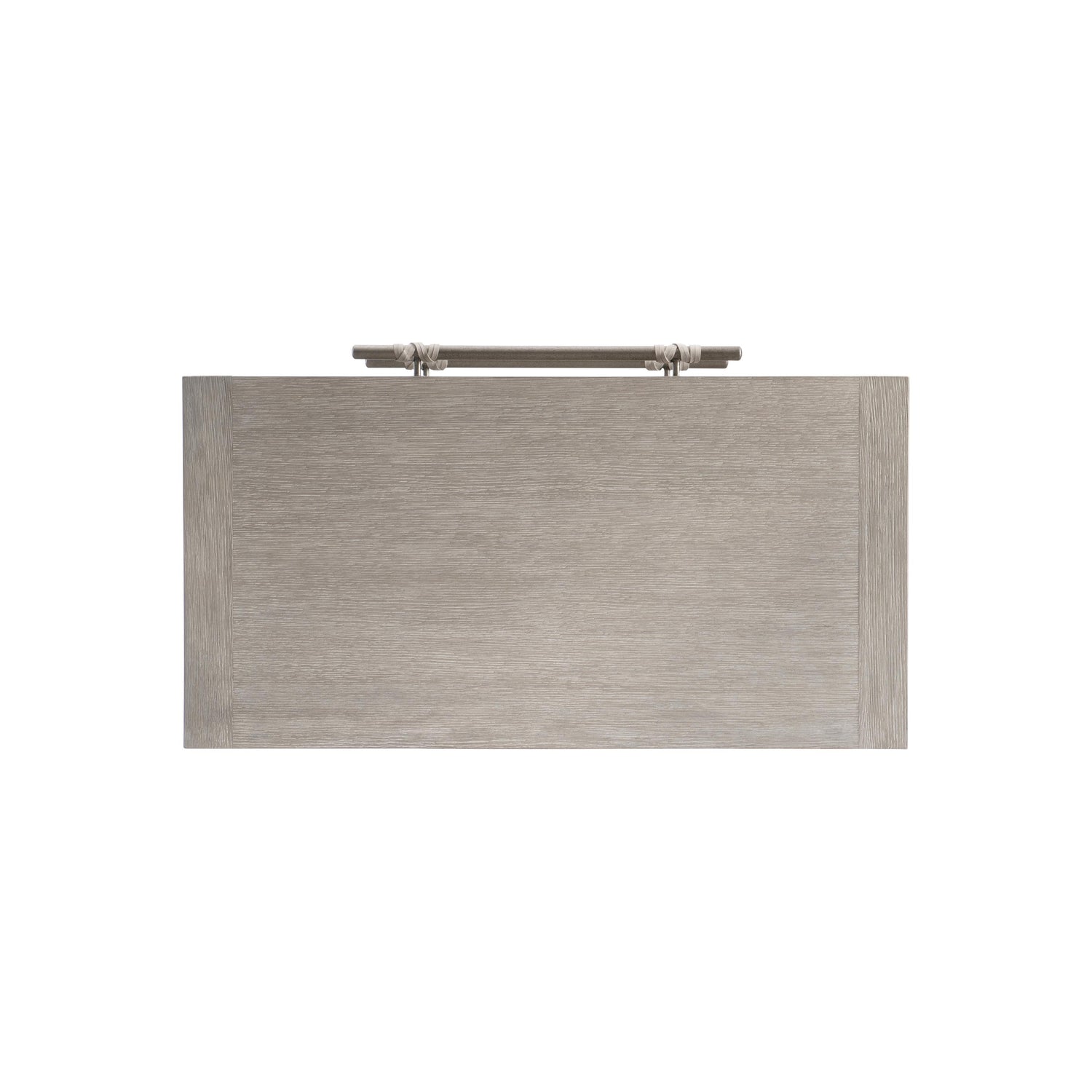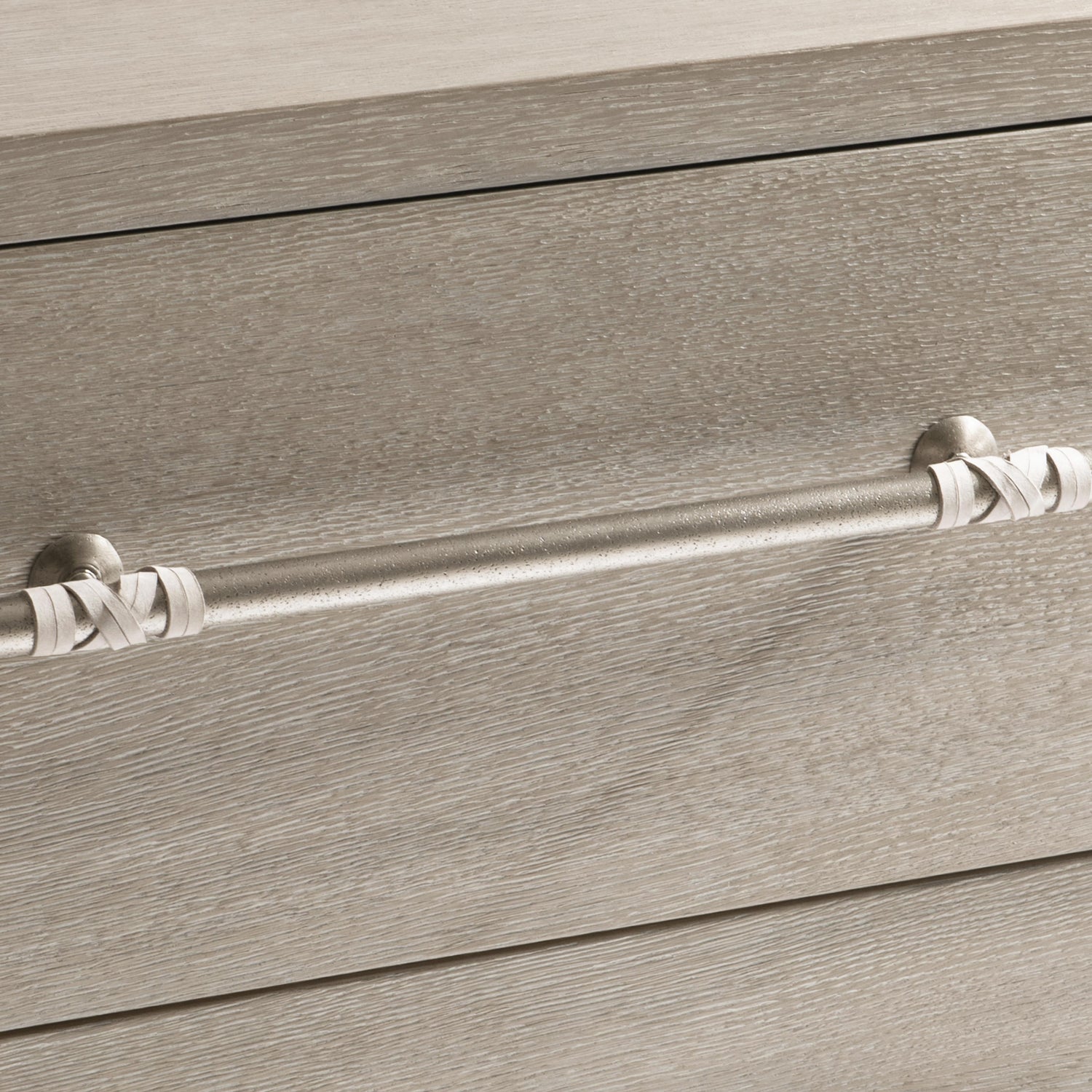 - Two soft-close drawers, each with flat leather-wrapped drawer pulls