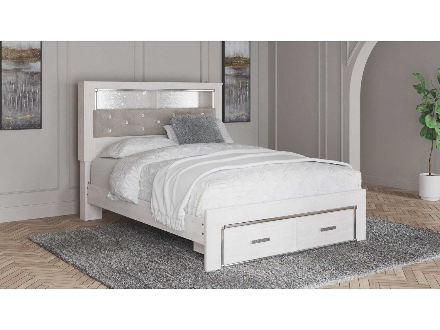- Includes queen upholstered panel bookcase headboard, storage footboard, platform rails and roll slats