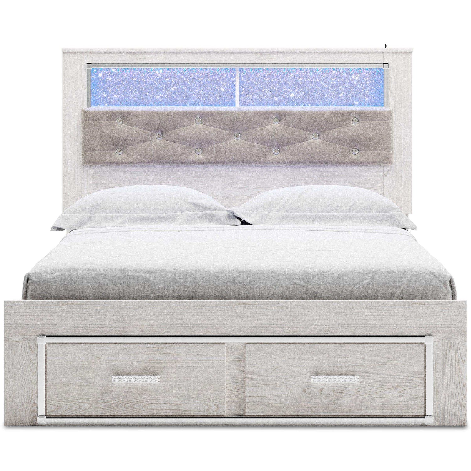 The epitome of fashion-forward design, this queen upholstered bookcase bed is a beautiful blend of comfort and luxury. Shiny chrome-tone accents, a pearlized finish and button-tufted upholstery bring a glam touch to the richly rustic appearance. Remote-controlled LED lighting adds style and modern convenience to your restful retreat.
