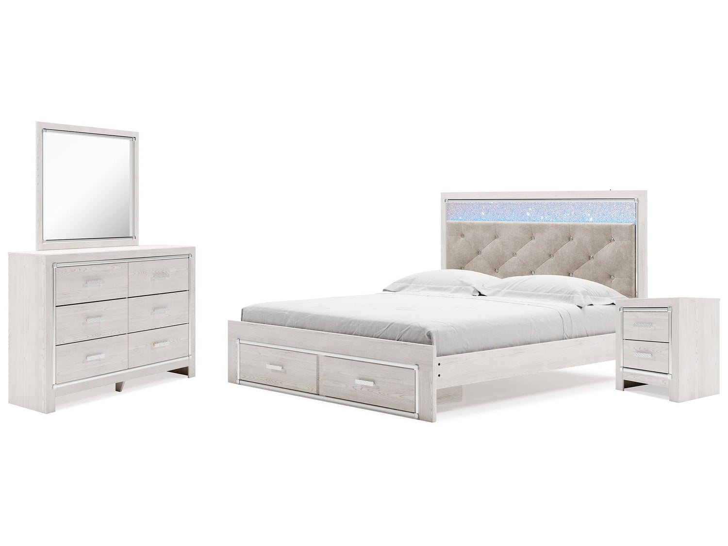 Altyra White King Upholstered Panel Storage Bedroom Set with Dresser, Mirror and Nightstand