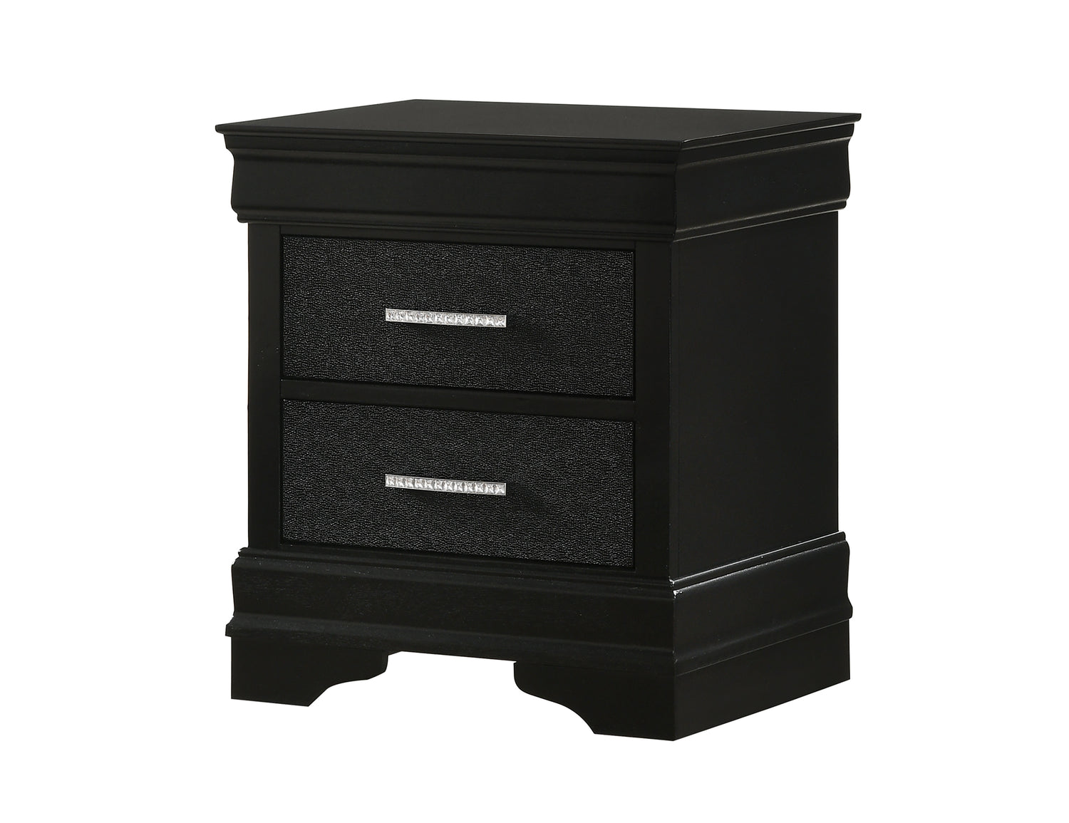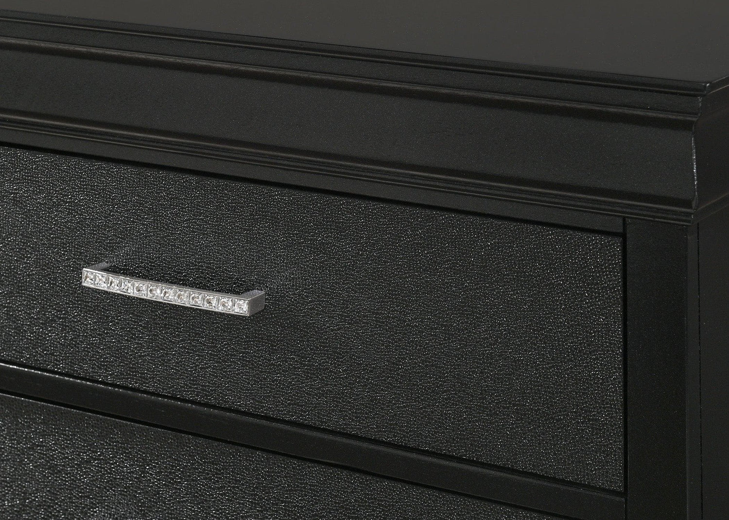 This bedroom set embodies a refined elegance with its rich black hue and luxurious textures, perfect for creating a serene and sophisticated sanctuary. The centerpiece is a sumptuous bed framed by a headboard with diamond-tufted detailing, offering a touch of opulence. The accompanying pieces, including a dresser with a gracefully matching mirror, tall chest, and nightstand, all feature a textured finish that adds depth and character to the suite.