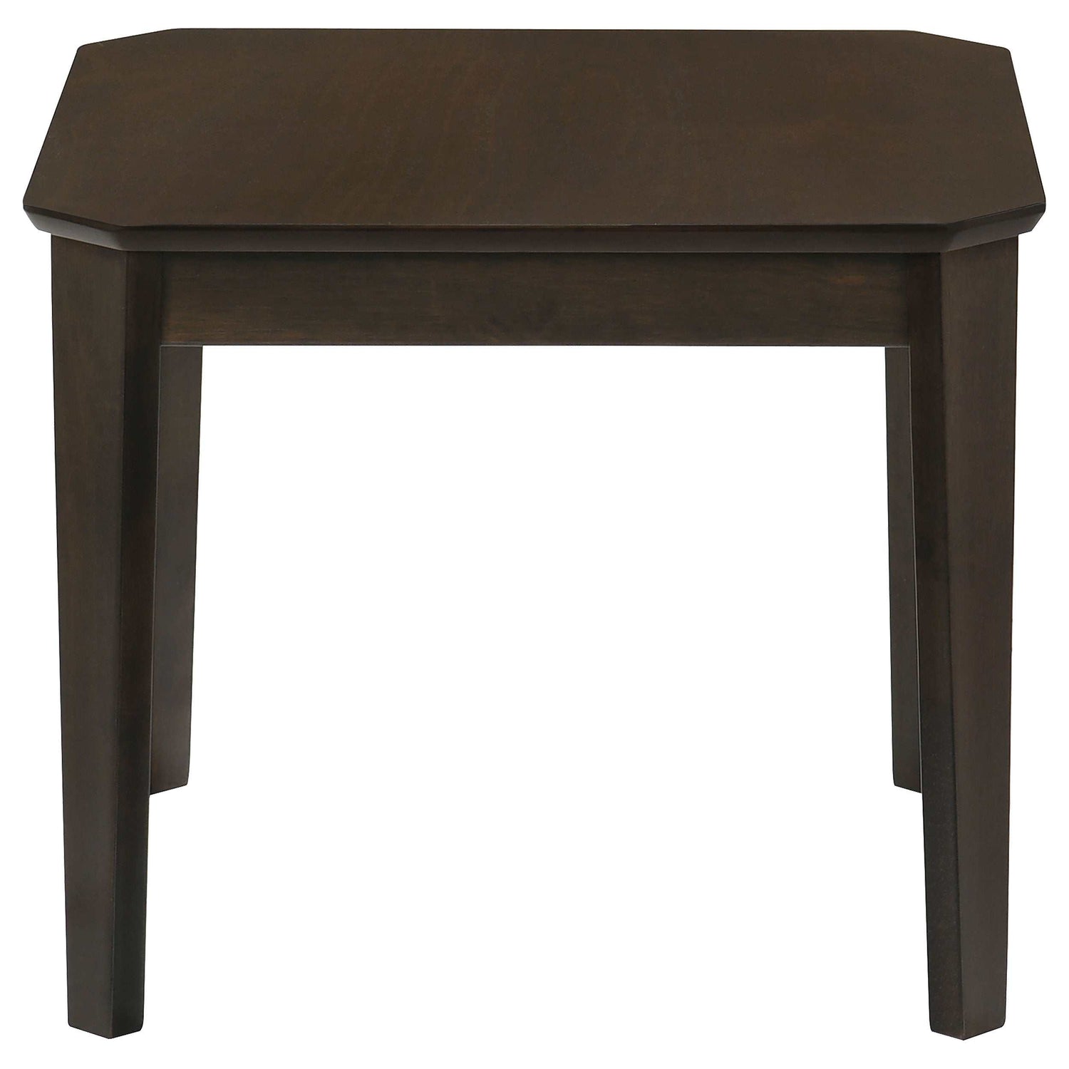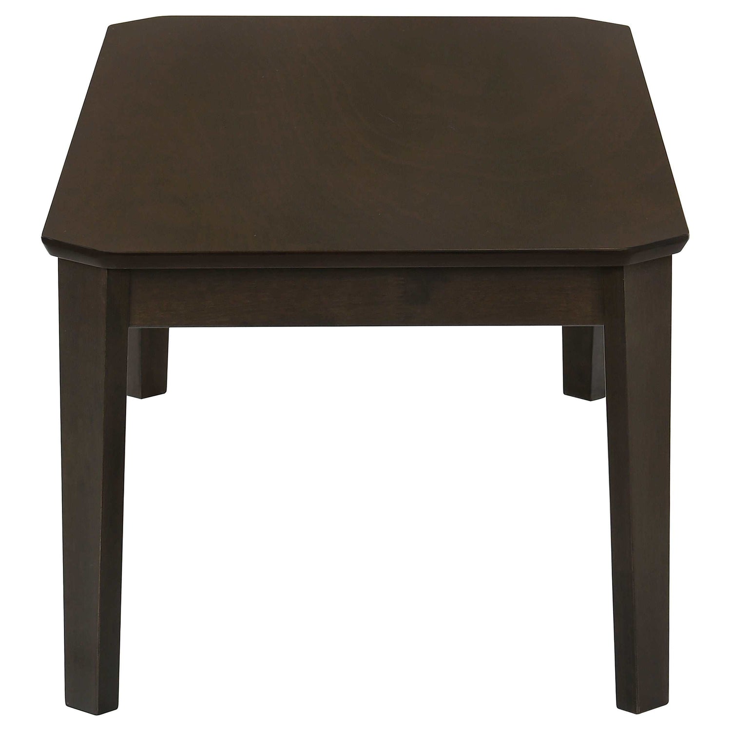 Casual style and simple lines enhance this three-piece occasional table set. Complete with a coffee table and two end tables, each furniture piece offers a rich, dark brown finish that lends a traditional flair. A smooth tabletop also features notched corners that soften the edges. Slim and straight legs extend to the floor and offer a subtle tapered foot. Place this coffee table and two end tables in a compact living room space for a touch of warmth and class.