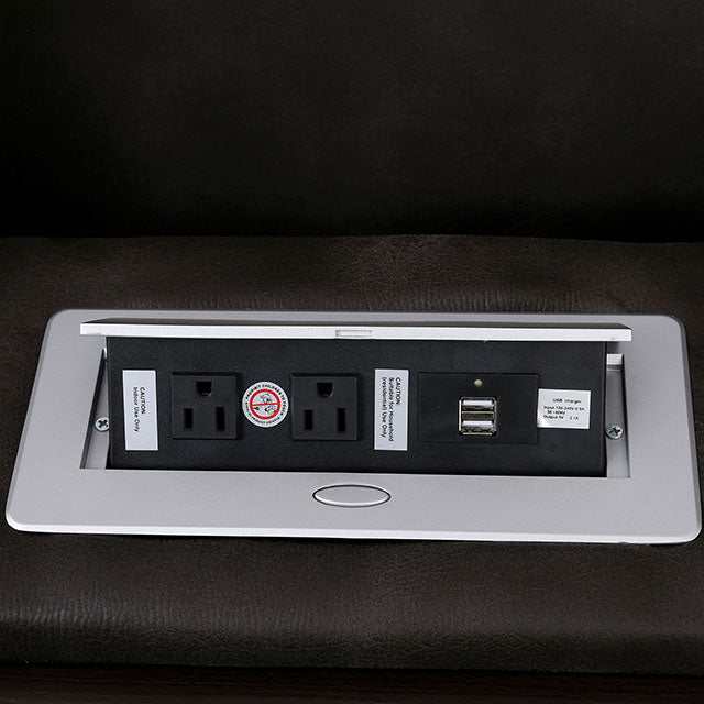 Experience the luxurious comfort and contemporary style of this multi-functional sofa with two recliners. The middle seatback features a drop-down table with reading lights, two cup holders, a USB charging port, and an A,C electrical outlet. The arms lift up exposing a storage compartment with ample storage for remotes, phones, and other accessories. The cover is a soft, luxurious, and durable fabric with an accent stitch to highlight the sleek design.