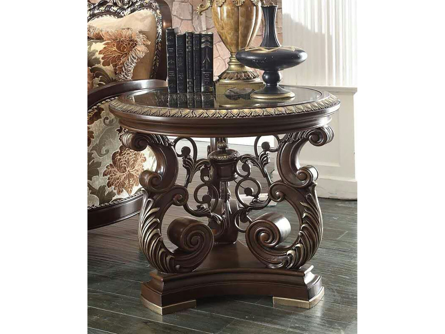 The intricately adorned HD-8013 End Table enhances the refined ambiance of your formal living space. Its graceful curves introduce an element of elegance to its luxurious style. The carvings boast a brown cherry finish with gold tipping, adding an extra layer of sophistication.