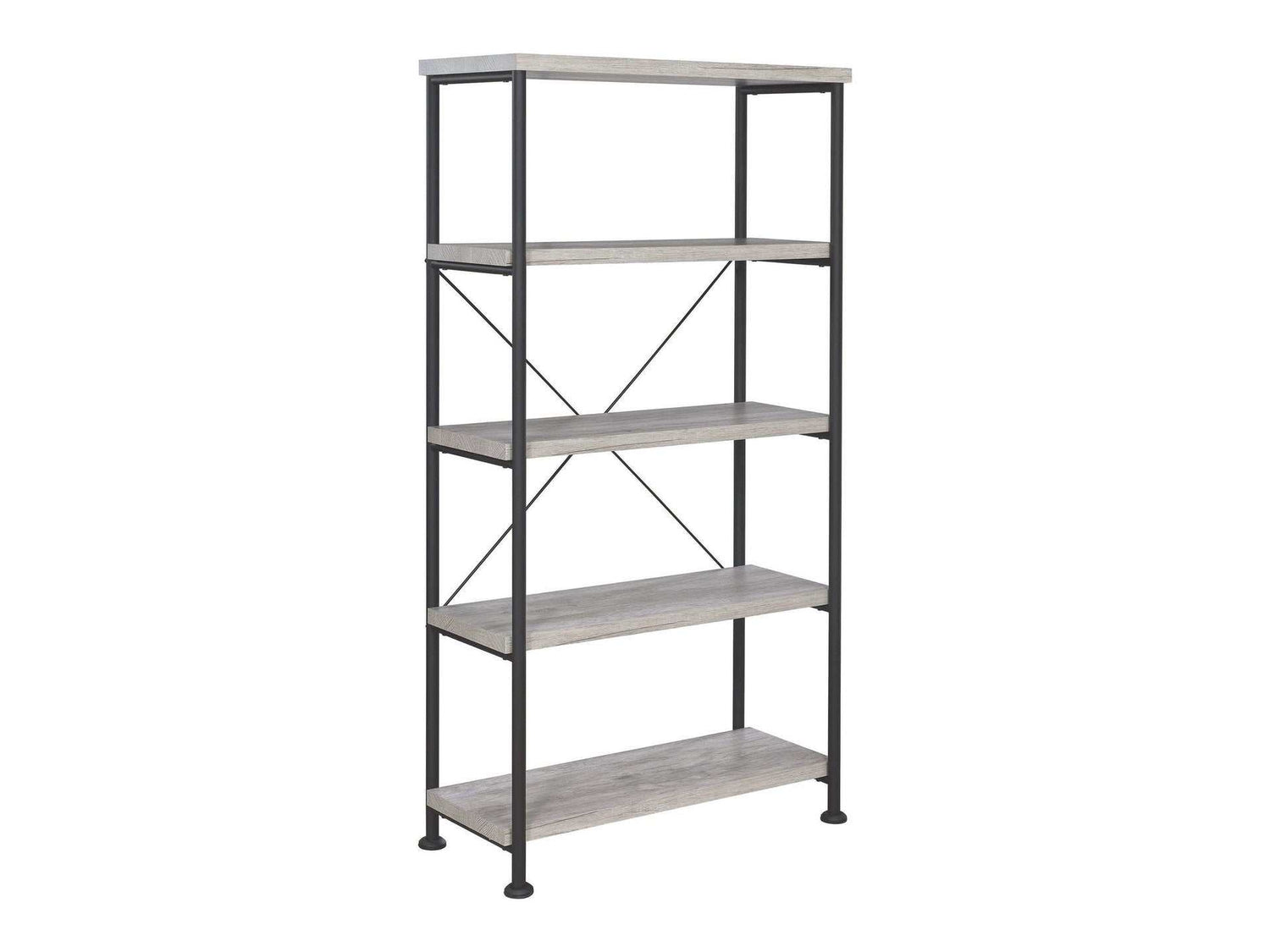 - Industrial bookcase in grey driftwood with black metal frame boasts clean lines for your modern decor