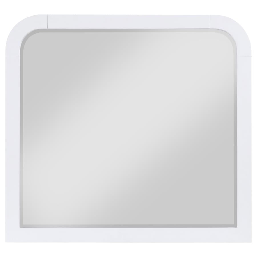 Simplicity of color and silhouette highlight a five-piece modern bedroom set that includes an upholstered bed, nightstand, chest, and dresser and mirror combination. Fresh and light, the set brings airy elegance, featuring a pearl white finish and light beige, textured upholstery over foam padded for exceptional lounging. The bed features a tall headboard and low footboard, with rounded corners echoed in the drawer fronts of each storage piece. With plenty of space for clothing, accessories, and beyond, the set offers felt lined top drawers perfect for delicate items. Elegant curves and clear bar pulls complete the set to perfection, delivering the lovely blend of sophistication and simplicity. This set includes the bed headboard, footboard and rails, a chest, a nightstand, a dresser and the dresser mirror.