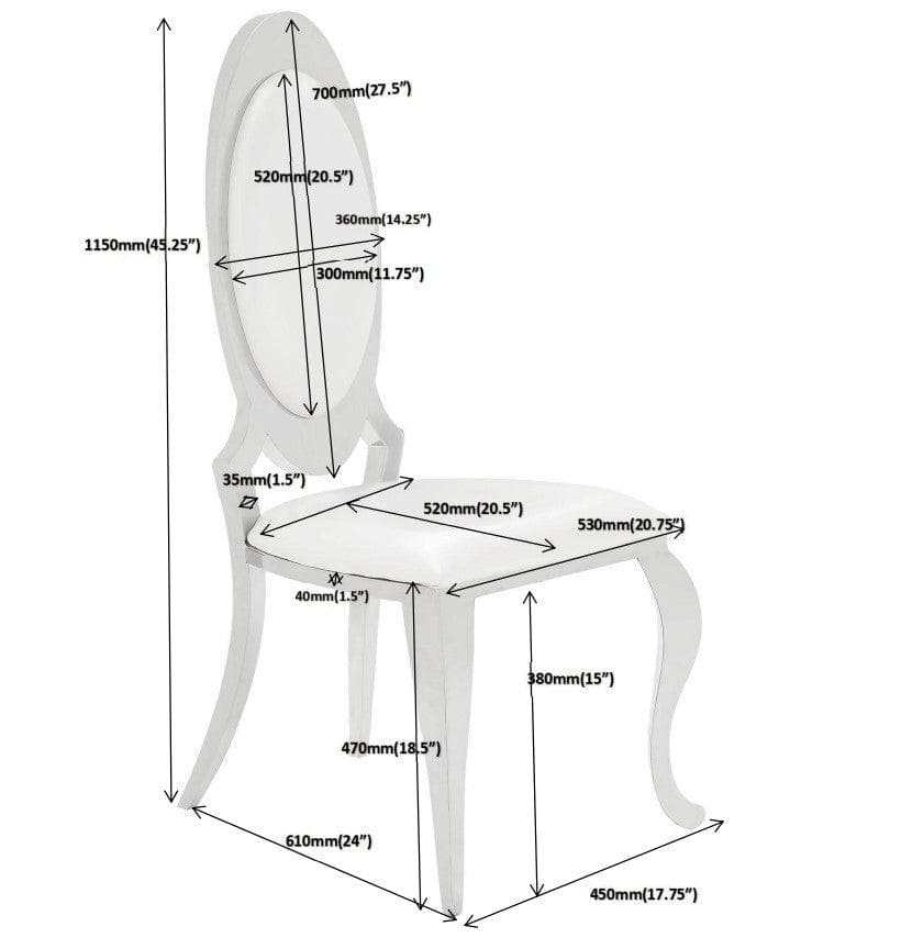 Regal ambiance in a transitional package. Enjoy a hint of fresh modern style in this dining chair. A traditional silhouette features a lovely oval seat back and ornate curved legs. Creamy white upholstery delivers a bright effect that contrasts with a chrome finish frame. Lift the personality of any space with this exceptional dining chair.