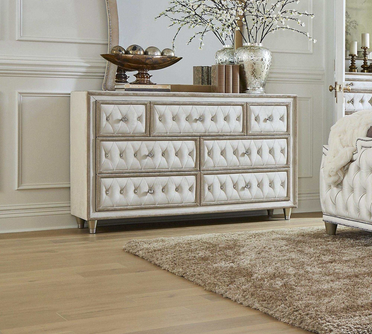 A traditional and modern bedroom set meets all expectations for an incredible impact in your sleeping space. Smooth and soft upholstered enhances each piece in this set. Coming in a camel and ivory color, this set is inspired by French Provincial décor. Crystal-like accents make their presence known within the button tufting. Gorgeous nailhead trim adds the finishing touch on this upholstered bedroom set.