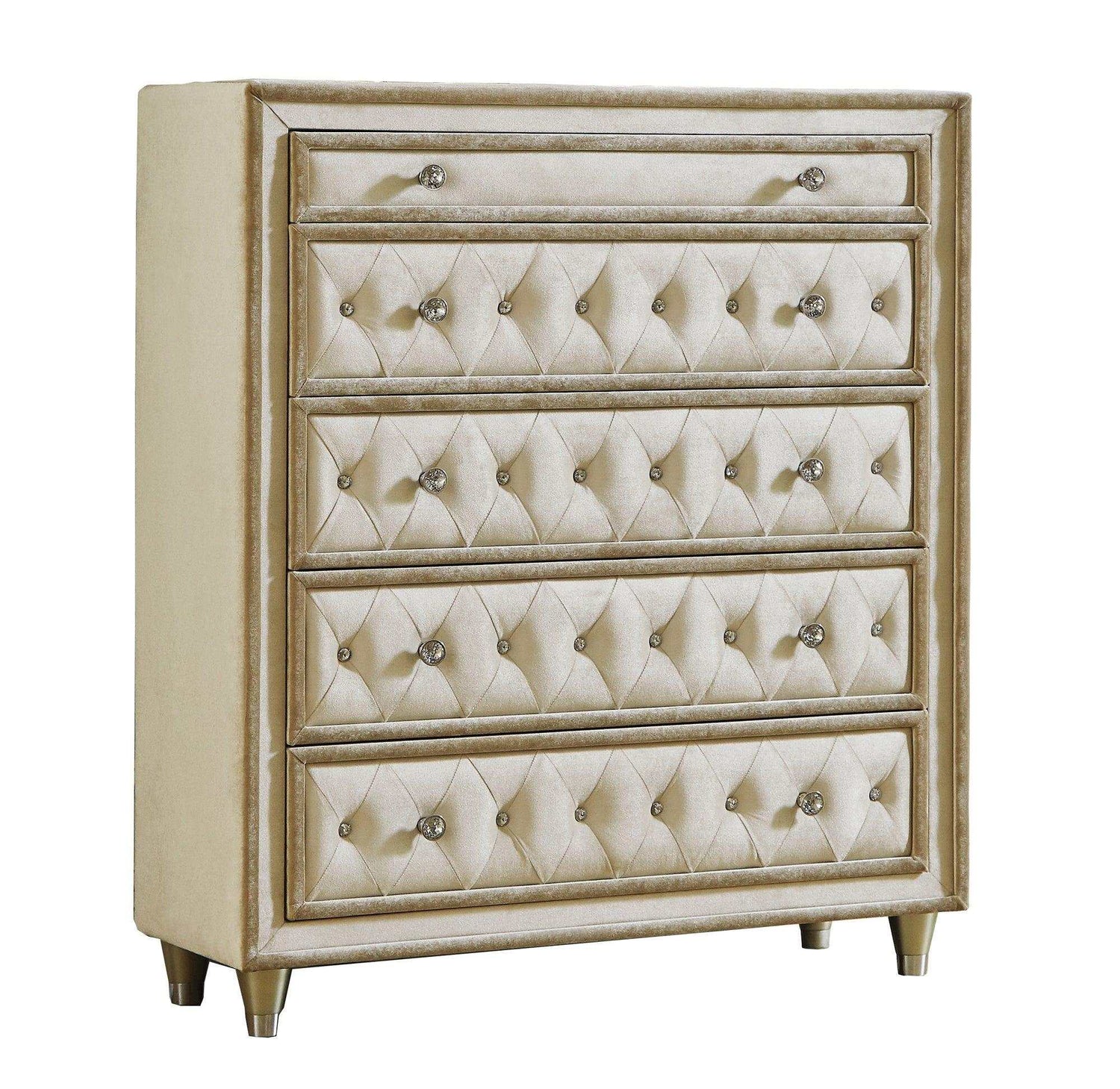 A traditional and modern bedroom set meets all expectations for an incredible impact in your sleeping space. Smooth and soft upholstered enhances each piece in this set. Coming in a camel and ivory color, this set is inspired by French Provincial décor. Crystal-like accents make their presence known within the button tufting. Gorgeous nailhead trim adds the finishing touch on this upholstered bedroom set.