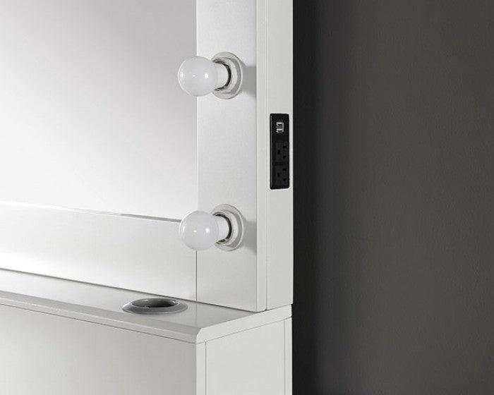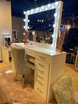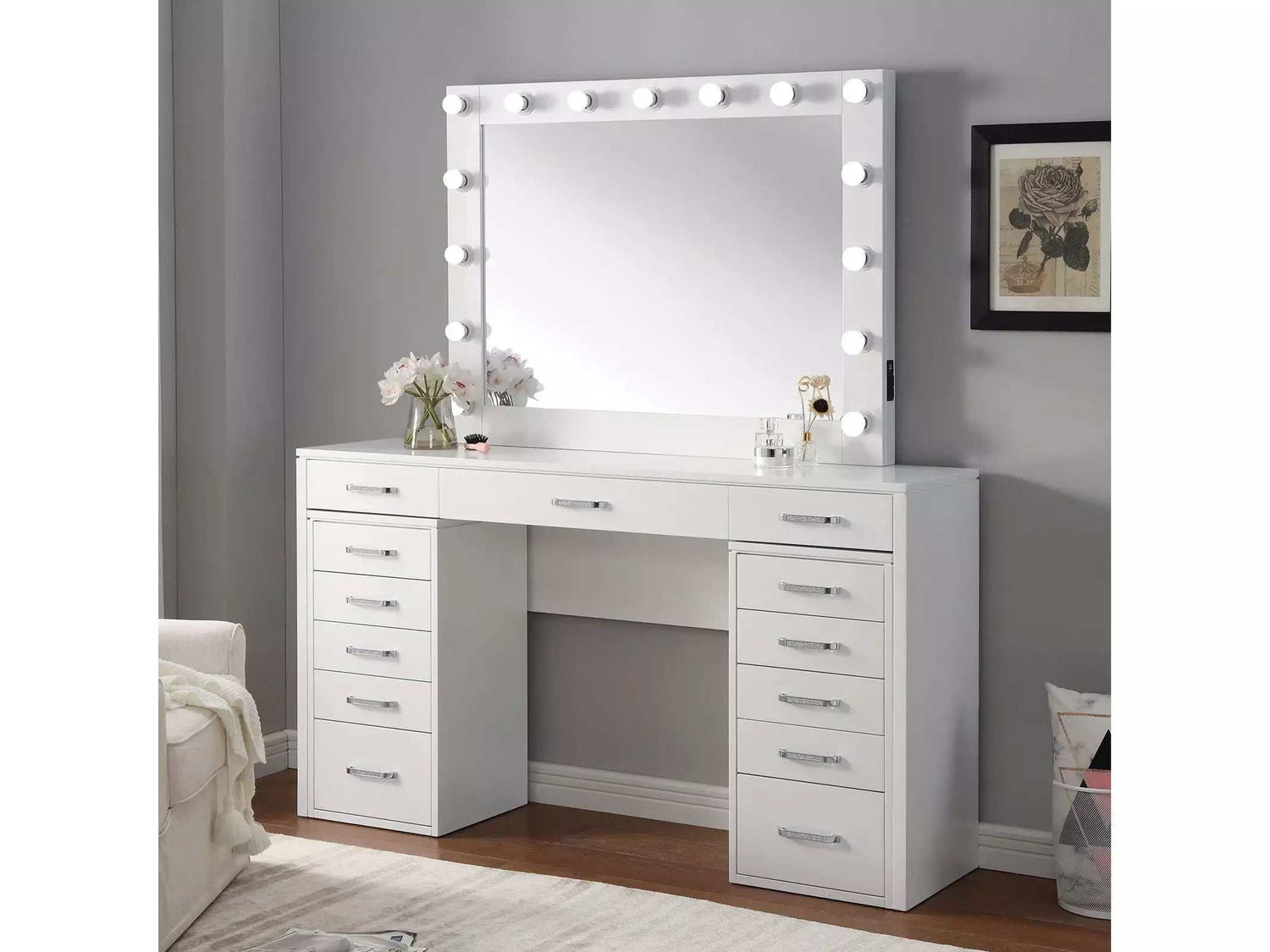 Lots and lots of drawers! There is a place for all of your jewelry in this brilliant piece. A series of bulbs line the edge of the matching mirror, with a six-inch base that can hold small items as you prepare for a night out.