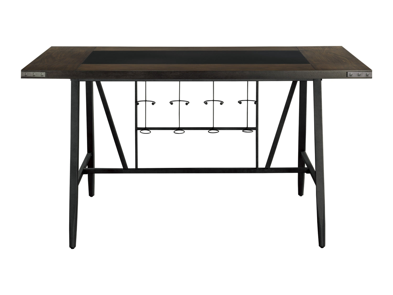 Perfectly styled for your casual dining room is the Appert Collection. This counter height offering features a dark gray metal base – with built in wine rack – that serves to support the wood top which frames a black rectangular glass insert.