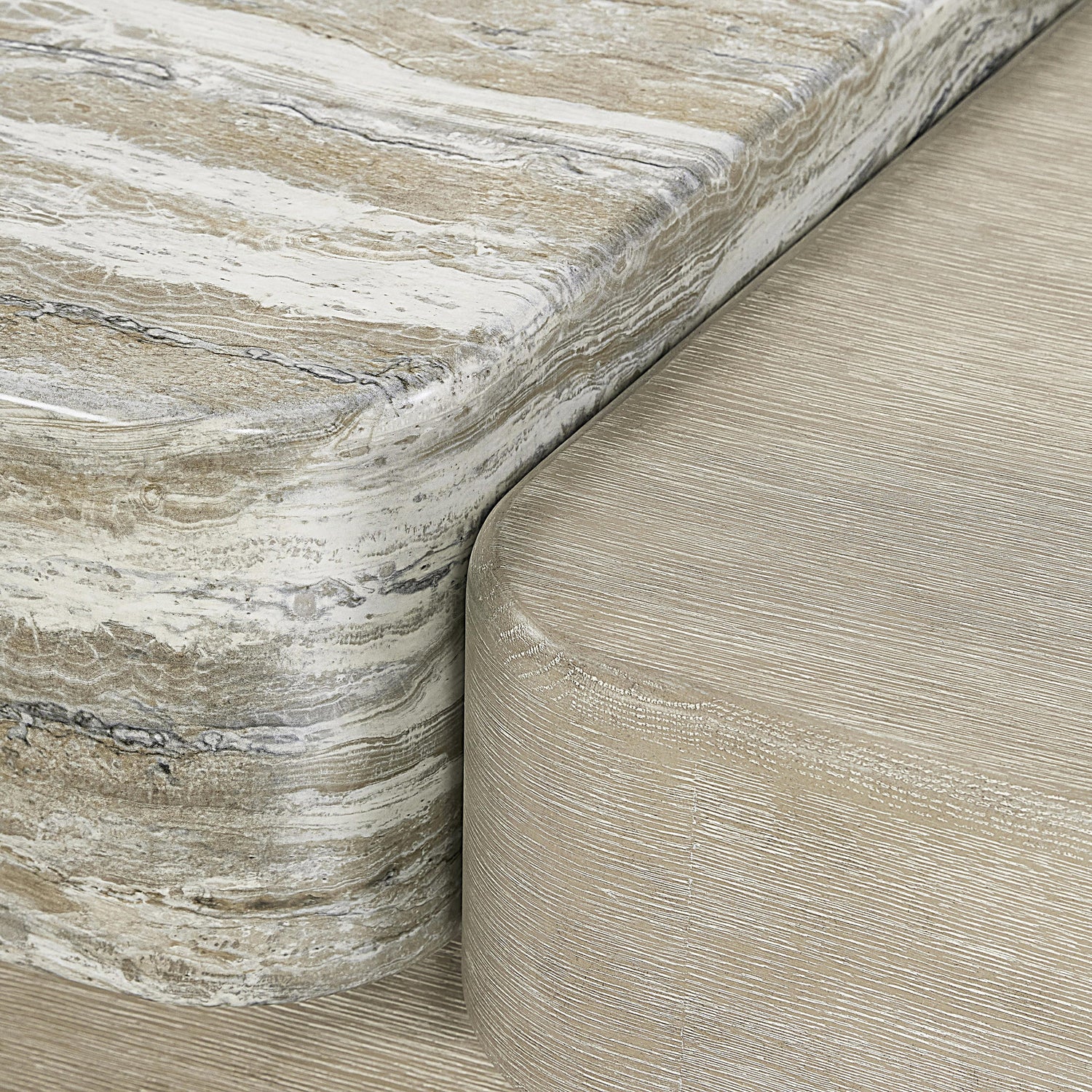 - Base and smaller top of white oak solids and veneers in Clay finish with larger faux stone top in Kalta finish