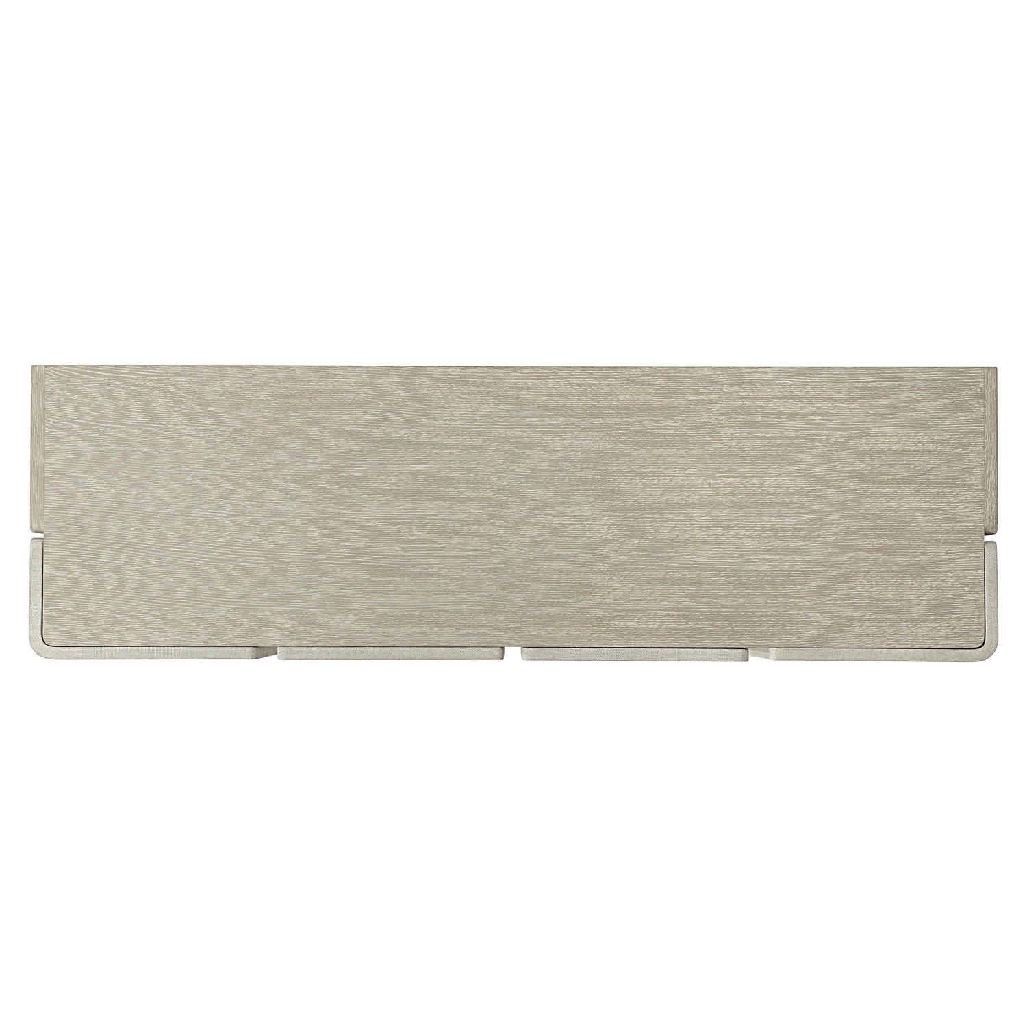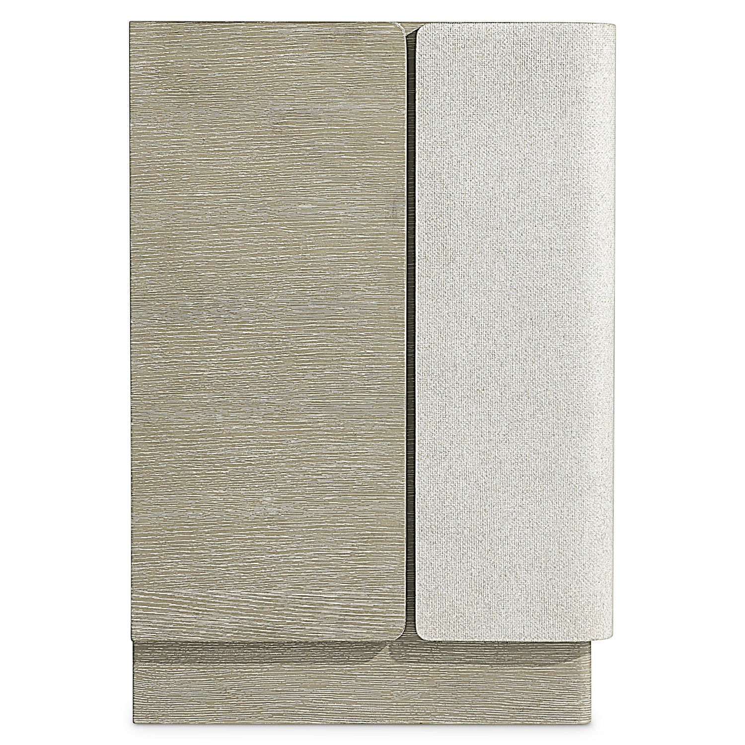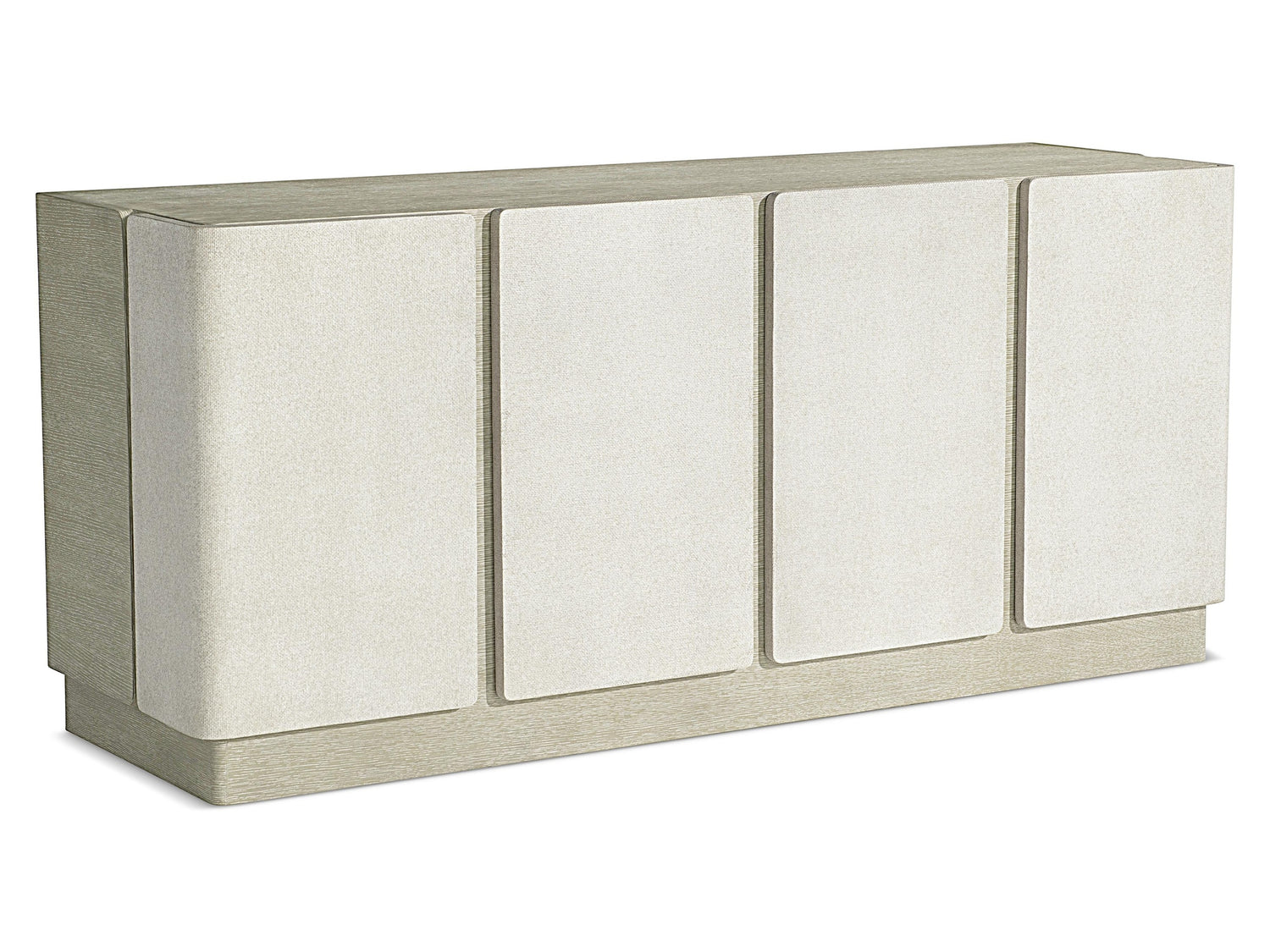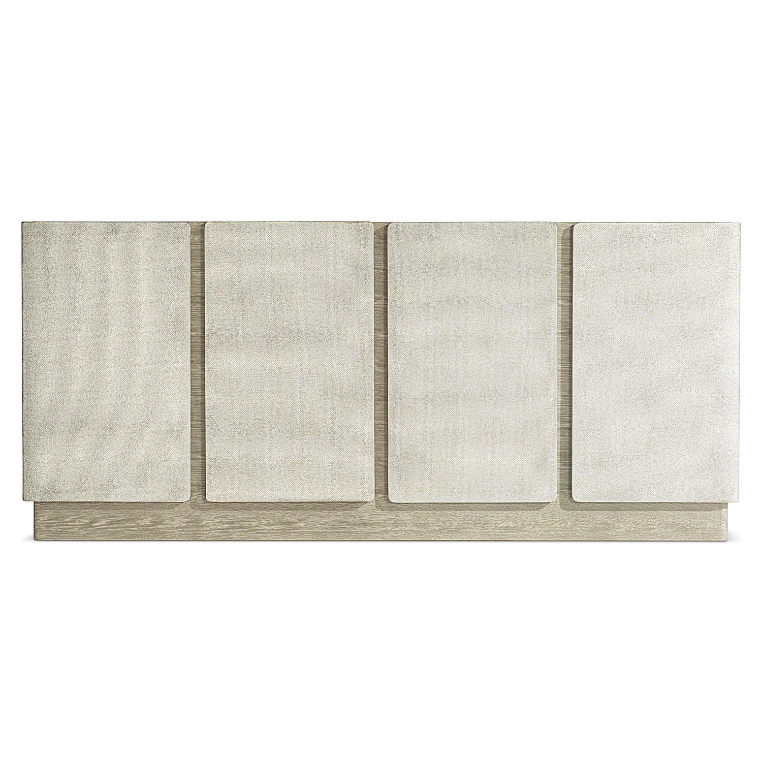 - Case in quartered oak solids and veneers in Clay finish with raffia-wrapped doors in Silt finish