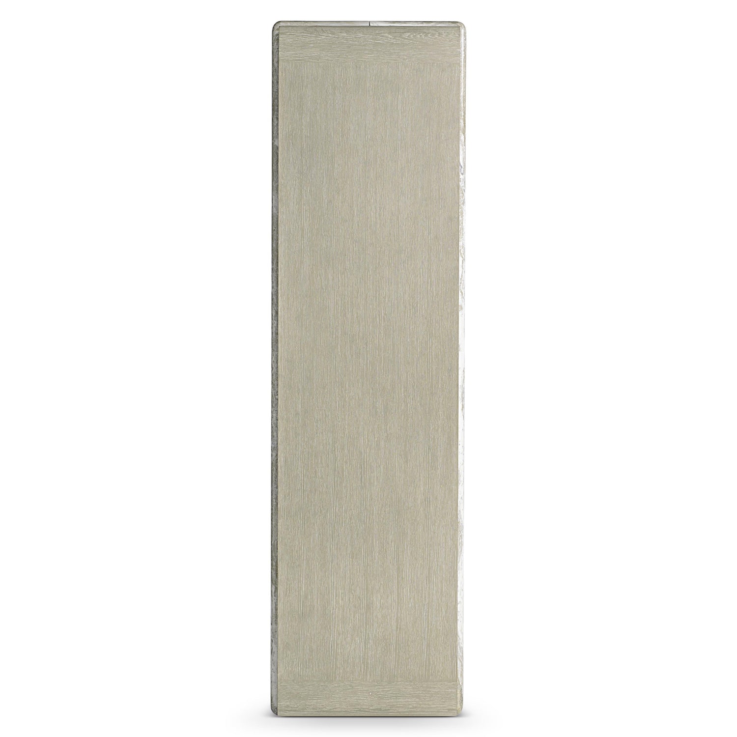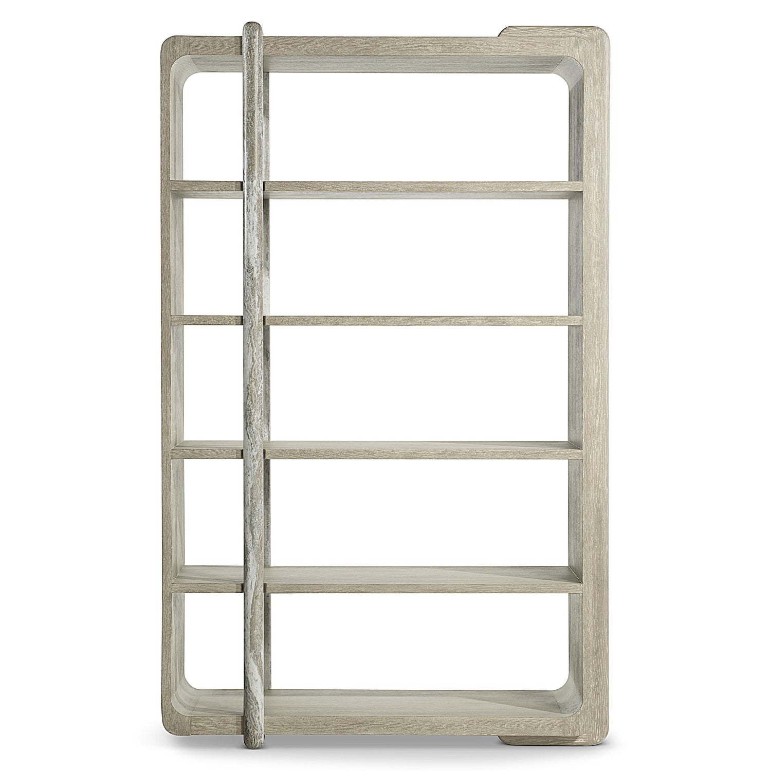 - Case and shelves of oak solids and veneers in Clay finish with one faux stone support post in Kalta finish that curves around the top and bottom shelves