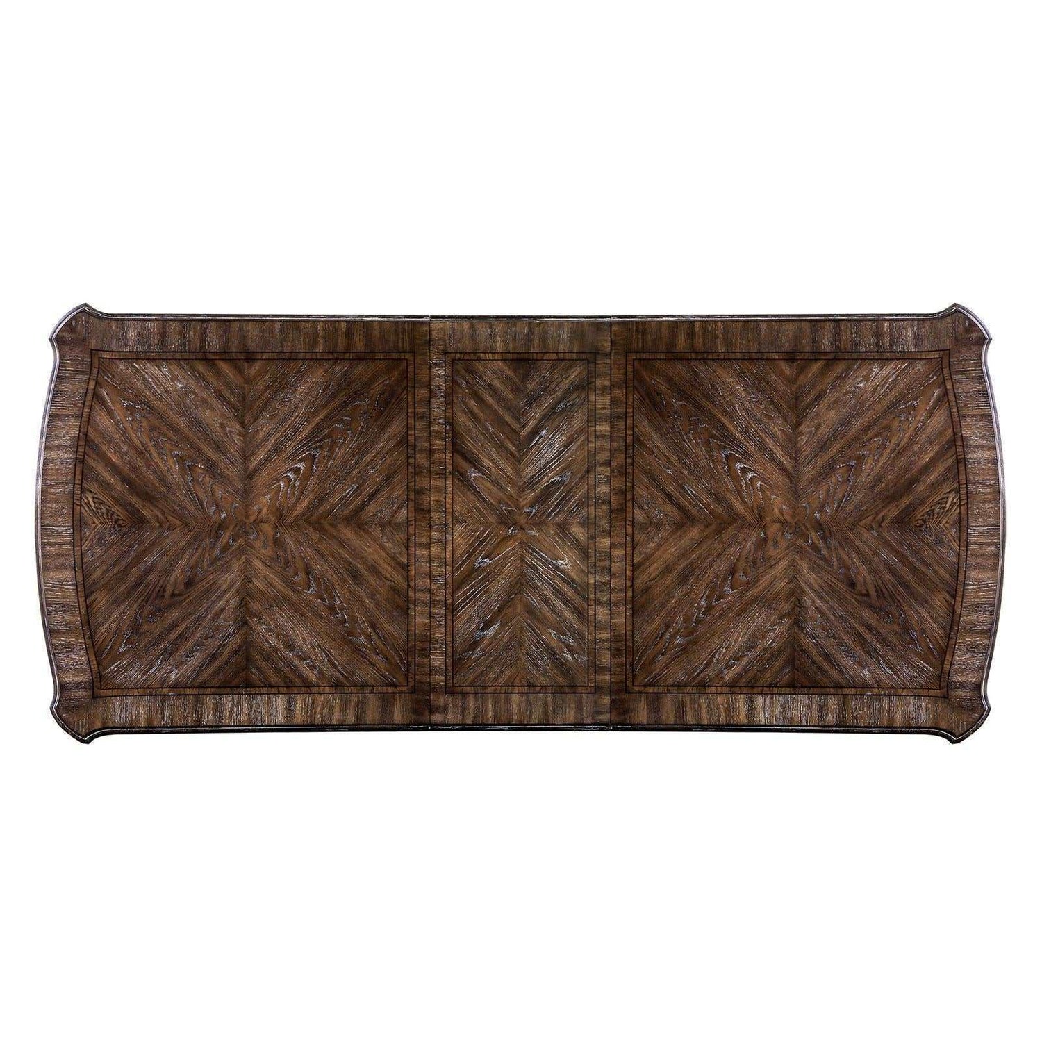 Beautiful wood inlay details and a dramatic pedestal base create a grand statement with elegance galore. The fabric upholstered chairs provide a stunning contrast against the rustic tone and finish for a look that is as cozy as it is chic. This sophisticated table features intricately carved crests along the skirt of the table to accentuate its traditional inspiration.