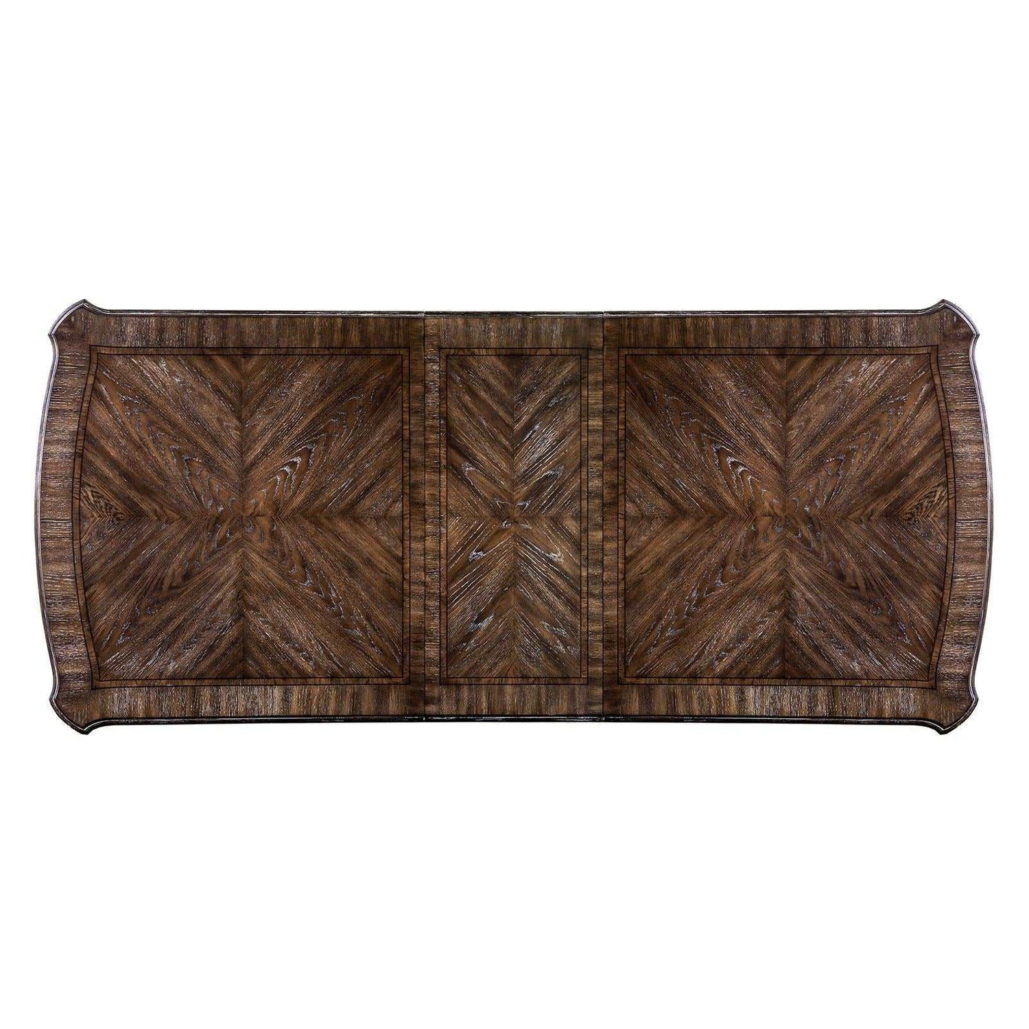 Beautiful wood inlay details and a dramatic pedestal base create a grand statement with elegance galore. The fabric upholstered chairs provide a stunning contrast against the rustic tone and finish for a look that is as cozy as it is chic. This sophisticated table features intricately carved crests along the skirt of the table to accentuate its traditional inspiration.