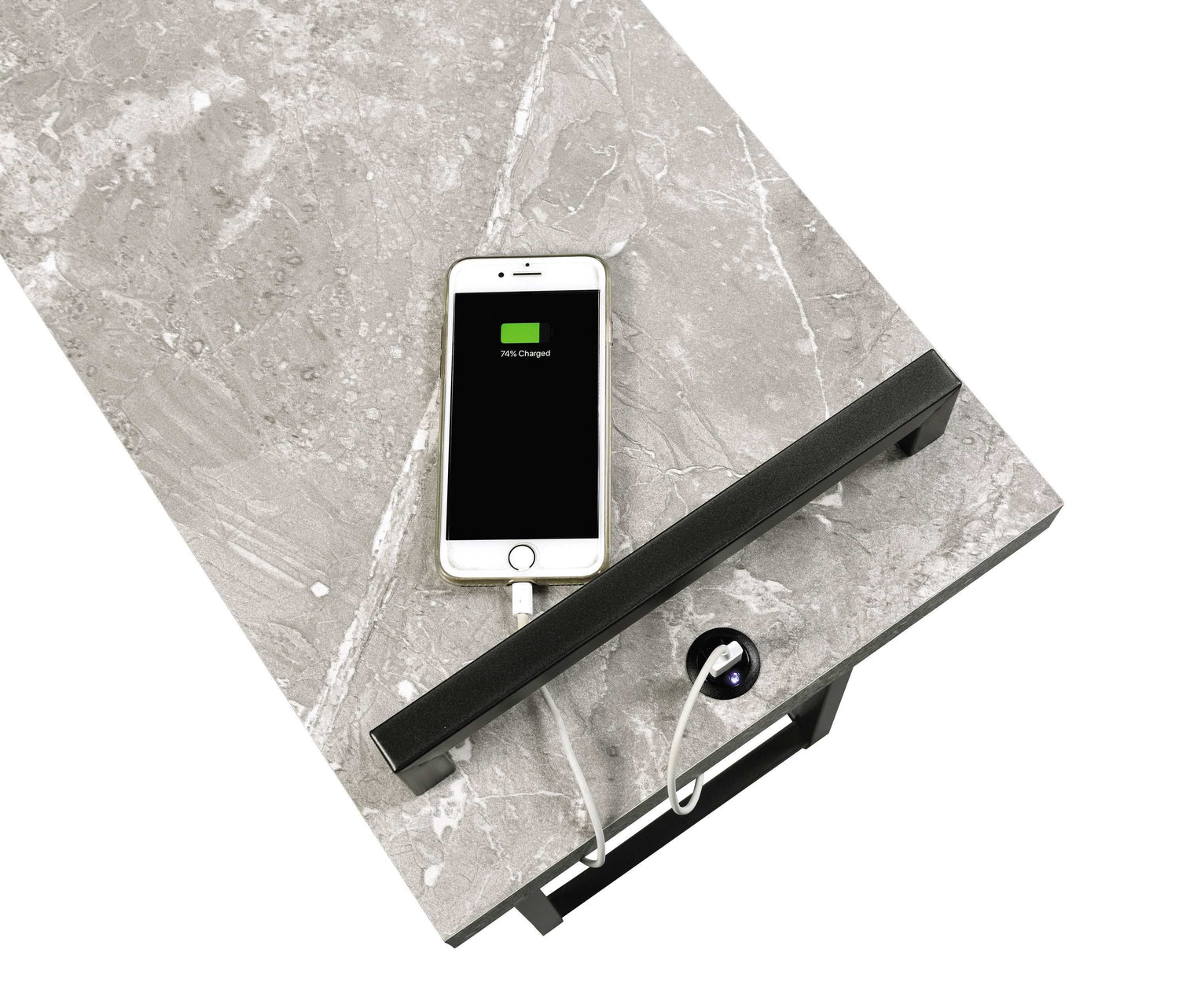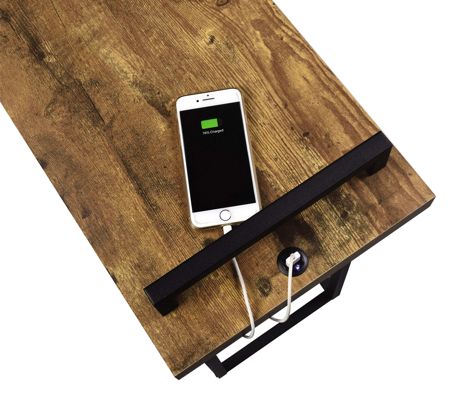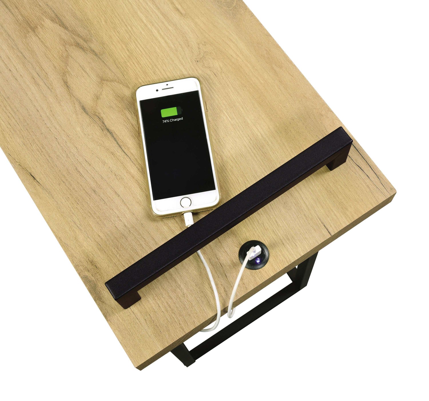 Contemporary design and sensibilities typify this elegant and practical accent table. With its amenities, it's ideal for a home office. Yet, it's also stylish enough for use in a family room. The wood table top is fashioned with a cool weathered pine finish, an engaging contrast to the handsome dark bronze legs and base. It also includes a convenient USB port for charging smartphones or tablets, which will make it a favorite for the younger contingent in your home.