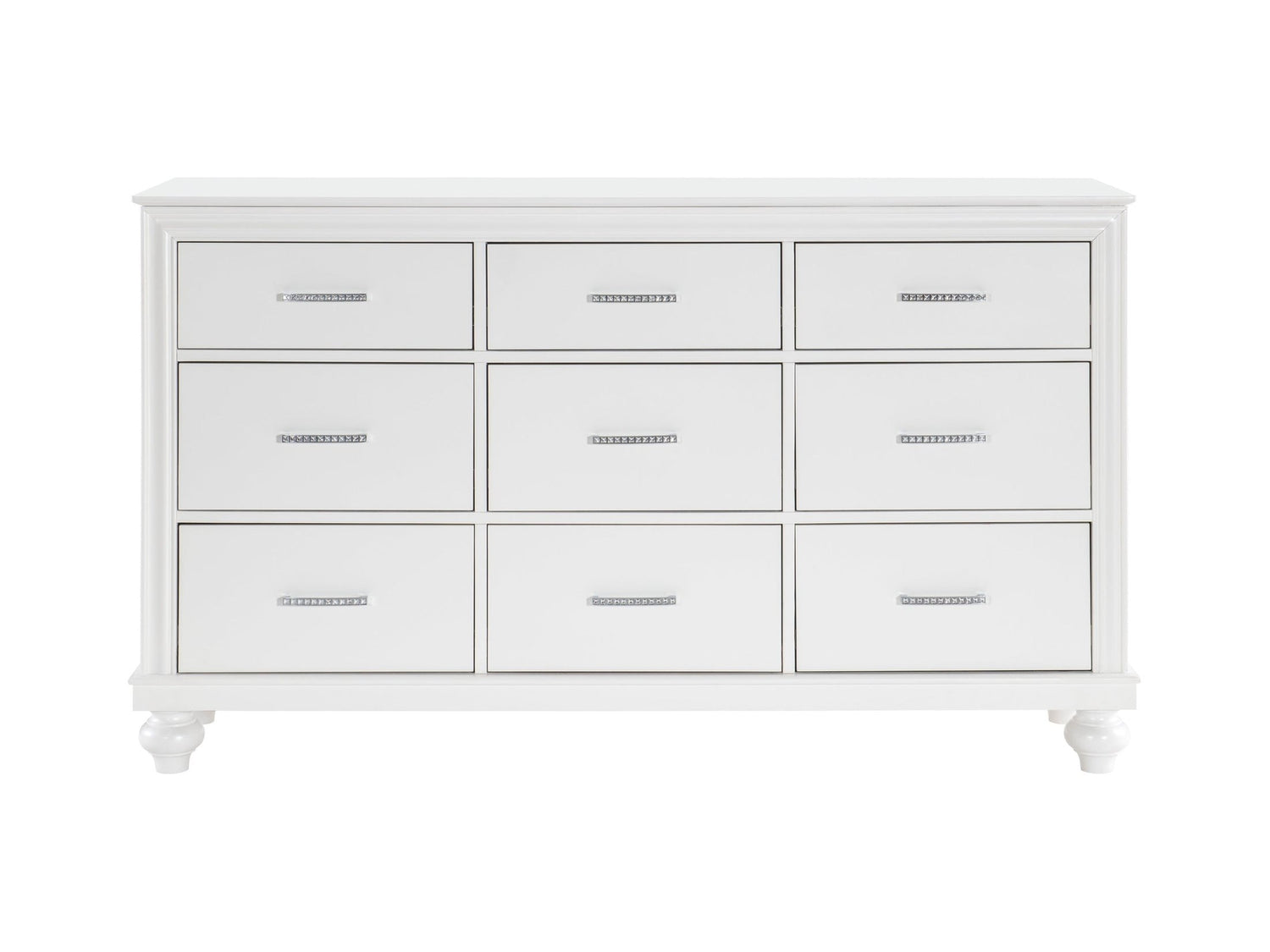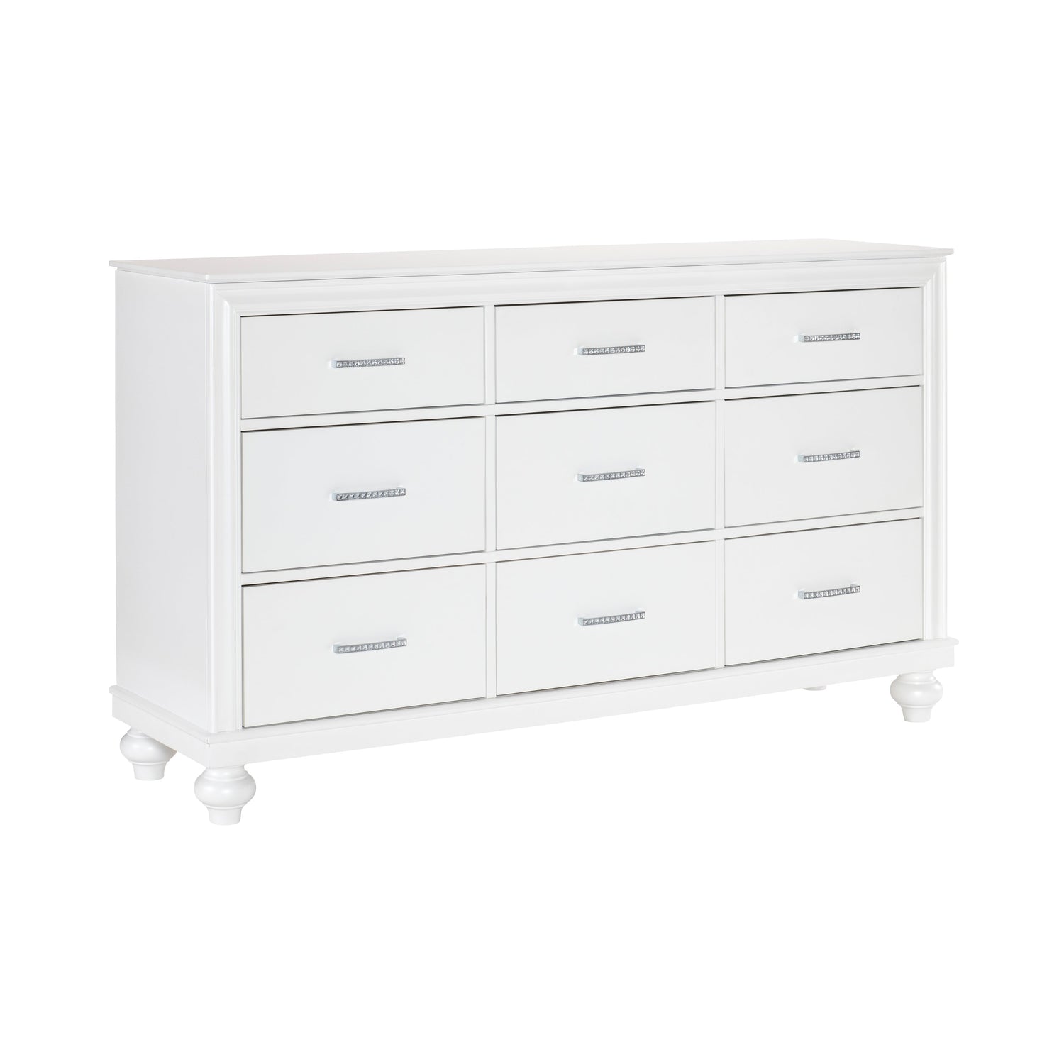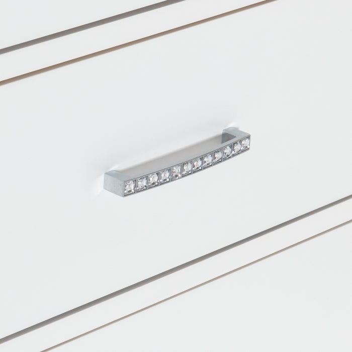 Visually mesmerizing, light dances off the accentuating details of the elegant Aria Collection. The eye-catching iridescence of the embedded acrylic crystal hardware that fronts each drawer sparkles against the bright white finish of the collection.