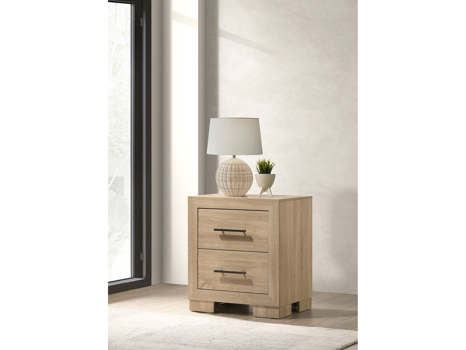 - Two-drawer nightstand in light oak finish with a compact and squared modern profile,