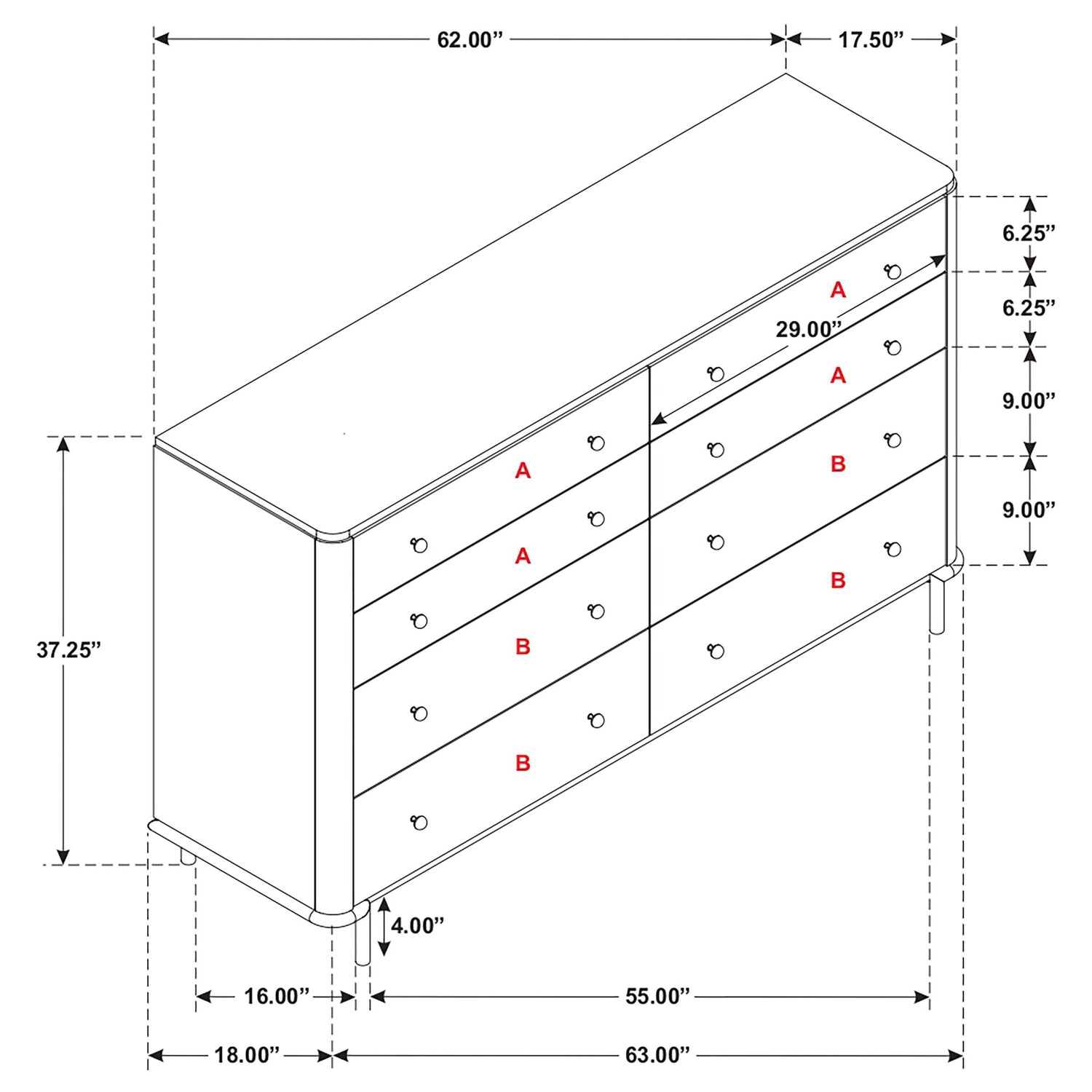 Dresser Dimensions: 63" W x 18" D x 37.25" H & Weight: 166.33 lbs