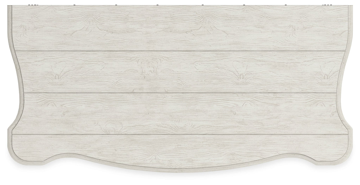 Add a touch of romance to your bedroom with this chest of drawers. Its antiqued white painted finish and serpentine-shaped silhouette details are the picture of easy elegance. Five spacious drawers offer ample storage space, while custom-designed bar pulls add originality.